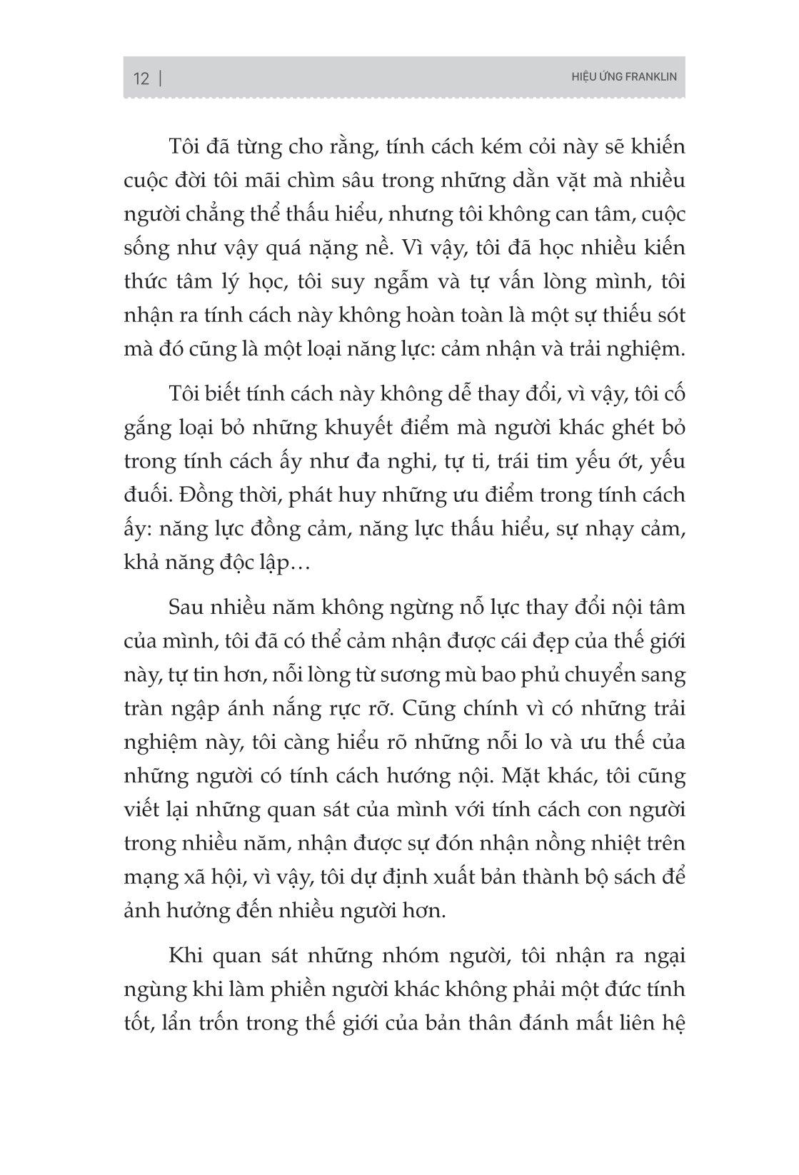 “Hiệu ứng Franklin - Mối quan hệ tốt bắt nguồn từ sự làm phiền” sẽ giúp bạn bước chân vào cuộc sống thực tế thông qua kiến thức tâm lý học phổ thông, dễ hiểu, là một sổ tay về giao tiếp xã hội mà bất kì ai cũng có thể đọc hiểu. Rồi bạn sẽ nhận ra, ngại ngùng khi làm phiền người khác không phải một đức tính tốt, lẩn trốn trong thế giới của bản thân đánh mất liên hệ với thế giới bên ngoài. Mối quan hệ tốt bắt đầu từ chuyện “làm phiền”. Sống ở đời, không thể lúc nào cũng đơn phương độc mã. Biết cách làm phiền người khác là một biểu hiện của EQ cao, cũng là một hình thức khiến đôi bên cảm nhận được sự ấm áp, cảm nhận được giá trị của nhau. Mong tất cả chúng ta đều học được cách mở lòng và nhờ vả người khác một cách đúng đắn.