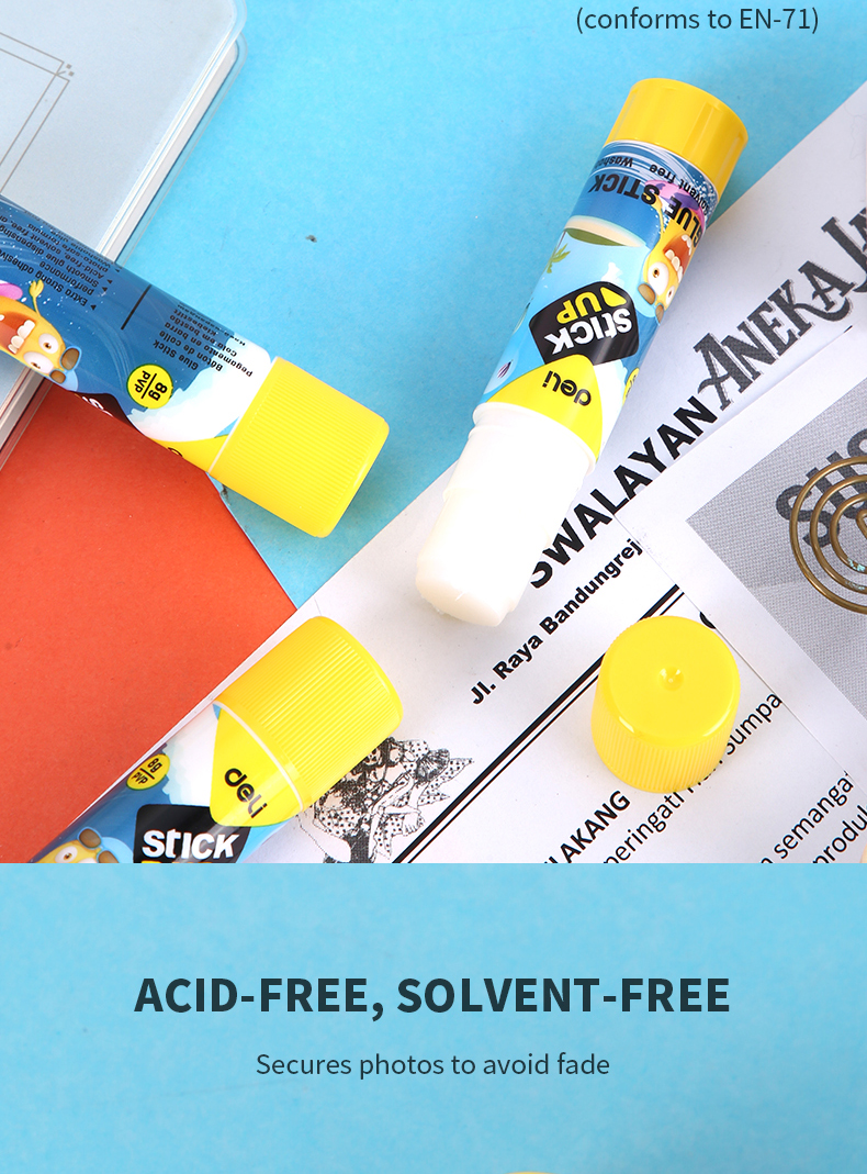 • Không chứa hóa chất độc hại, an toàn khi sử dụng • Dùng làm đồ thủ công, dán giấy, dán bao thư • Đầu dán hồ được thiết kế dạng bằng, cho hồ ra