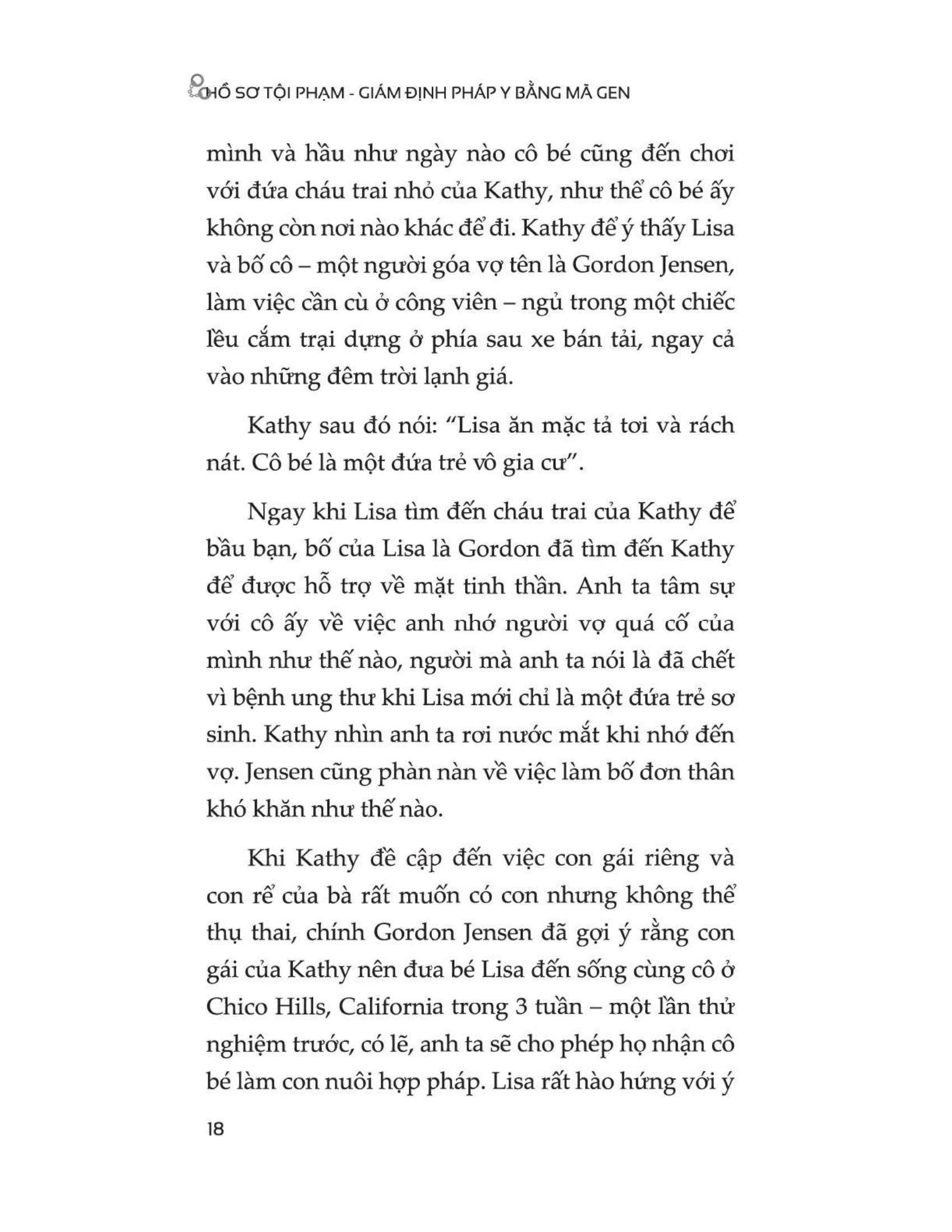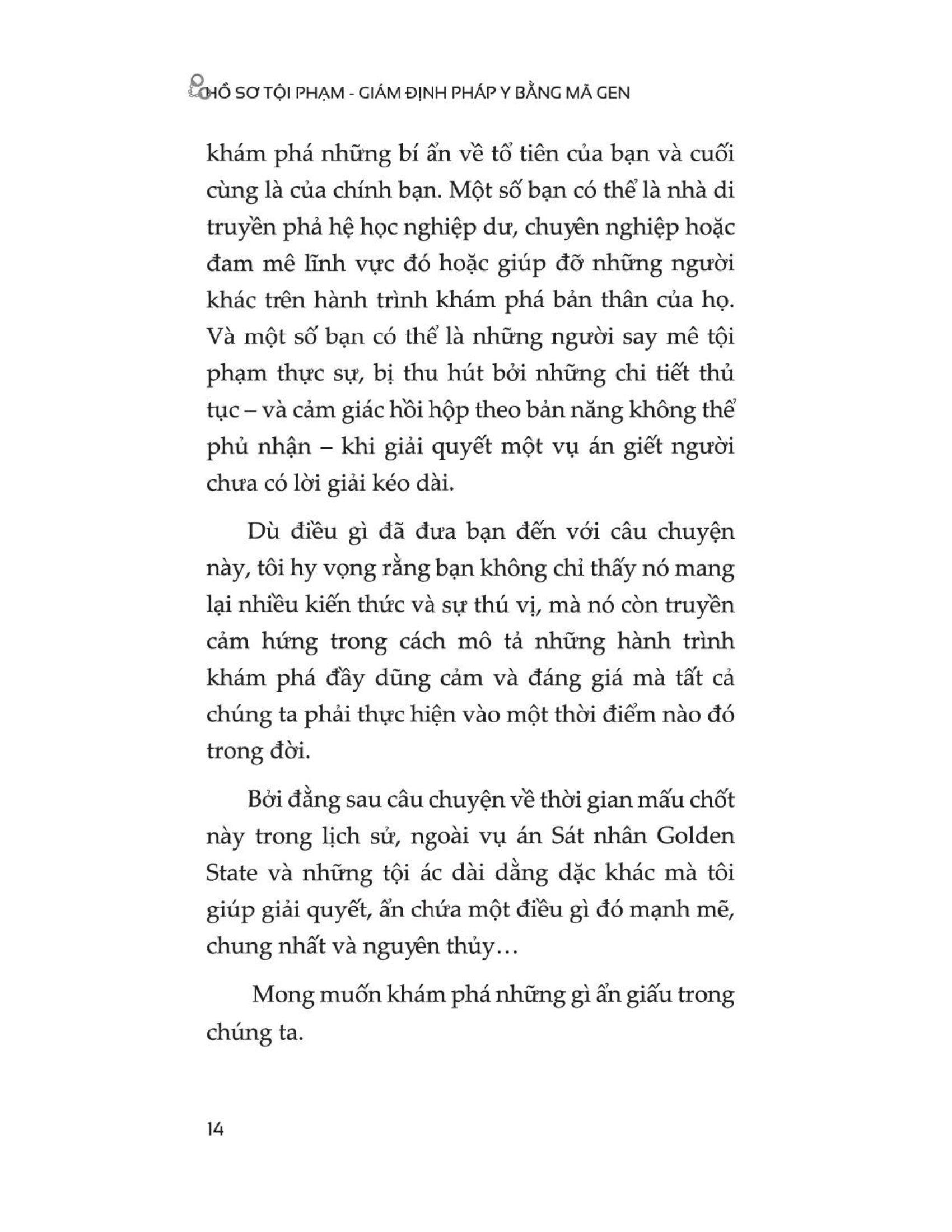 Hồ Sơ Tội Phạm - Giám Định Pháp Y Bằng Mã Gen “Một kiệt tác tội phạm CÓ THẬT được viết bởi một bậc thầy phá án lạnh lùng. Công việc điều tra DNA của Barbara Rae-Venter đã cách mạng hóa cách thức cơ quan thực thi pháp luật săn lùng những kẻ giết người hàng loạt.” Cơ thể bạn được tạo thành từ 30 nghìn tỉ tế bào và bạn thải ra khoảng 500 triệu tế bào mỗi ngày. Trên da đầu của bạn có khoảng 250 nghìn sợi tóc và rụng khoảng 50 đến 100 sợi tóc mỗi ngày. Bạn luôn để dại dấu vết ở bất kỳ nơi nào bạn lướt qua. Và nếu có đủ thời gian, tôi sẽ tìm thấy bạn. Hay nói cách khác, tôi biết rõ bạn là ai. Cuốn sách “HỒ SƠ TỘI PHẠM – GIÁM ĐỊNH PHÁP Y BẰNG MÃ GEN” sẽ dẫn dắt người đọc vào một hành trình sống động qua nhiều vụ án mà chính tác giả đã giải quyết, thường bắt đầu với ít hơn một mẫu DNA.