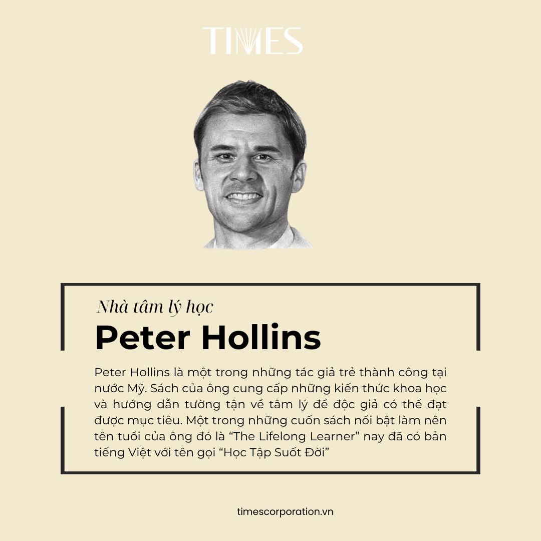 THÔNG TIN TÁC GIẢ Peter Hollins là một nhà tâm lý học chuyên tư vấn và nghiên cứu hành vi con người. Ông có bằng BS và MA về tâm lý học. Ông đã tư vấn huấn luyện cho hàng chục người từ mọi tầng lớp xã hội trong khoảng 10 năm. Ông có văn phòng riêng tại Seattle, Washington. Ngoài ra, ông còn được biết đến với vai trò là tác giả của rất nhiều cuốn sách về rèn luyện bản thân. Trong đó nổi bật nhất là những cuốn sách hướng dẫn về: Tính kỷ luật, tự giác, tinh thần nỗ lực không mệt mỏi, cách tìm động lực trong cuộc sống. Những cuốn sách được viết dựa trên kinh nghiệm học tập, nghiên cứu và huấn luyện cá nhân của ông. Chính vì vậy, nó đóng vai trò như một khóa học thực tế, cực kỳ hữu ích cho độc giả.
