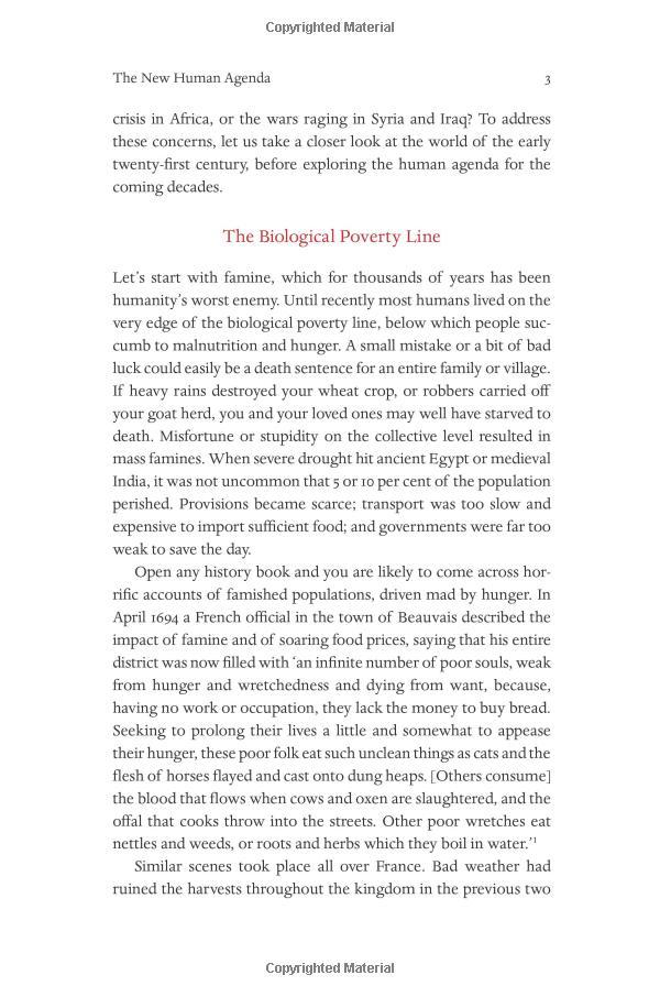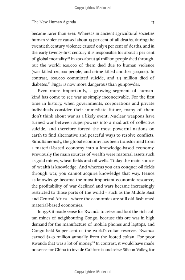 Over the past century humankind has managed to do the impossible and rein in famine, plague, and war. This may seem hard to accept, but, as Harari explains in his trademark style--thorough, yet riveting--famine, plague and war have been transformed from incomprehensible and uncontrollable forces of nature into manageable challenges. For the first time ever, more people die from eating too much than from eating too little; more people die from old age than from infectious diseases; and more people commit suicide than are killed by soldiers, terrorists and criminals put together. The average American is a thousand times more likely to die from binging at McDonalds than from being blown up by Al Qaeda.