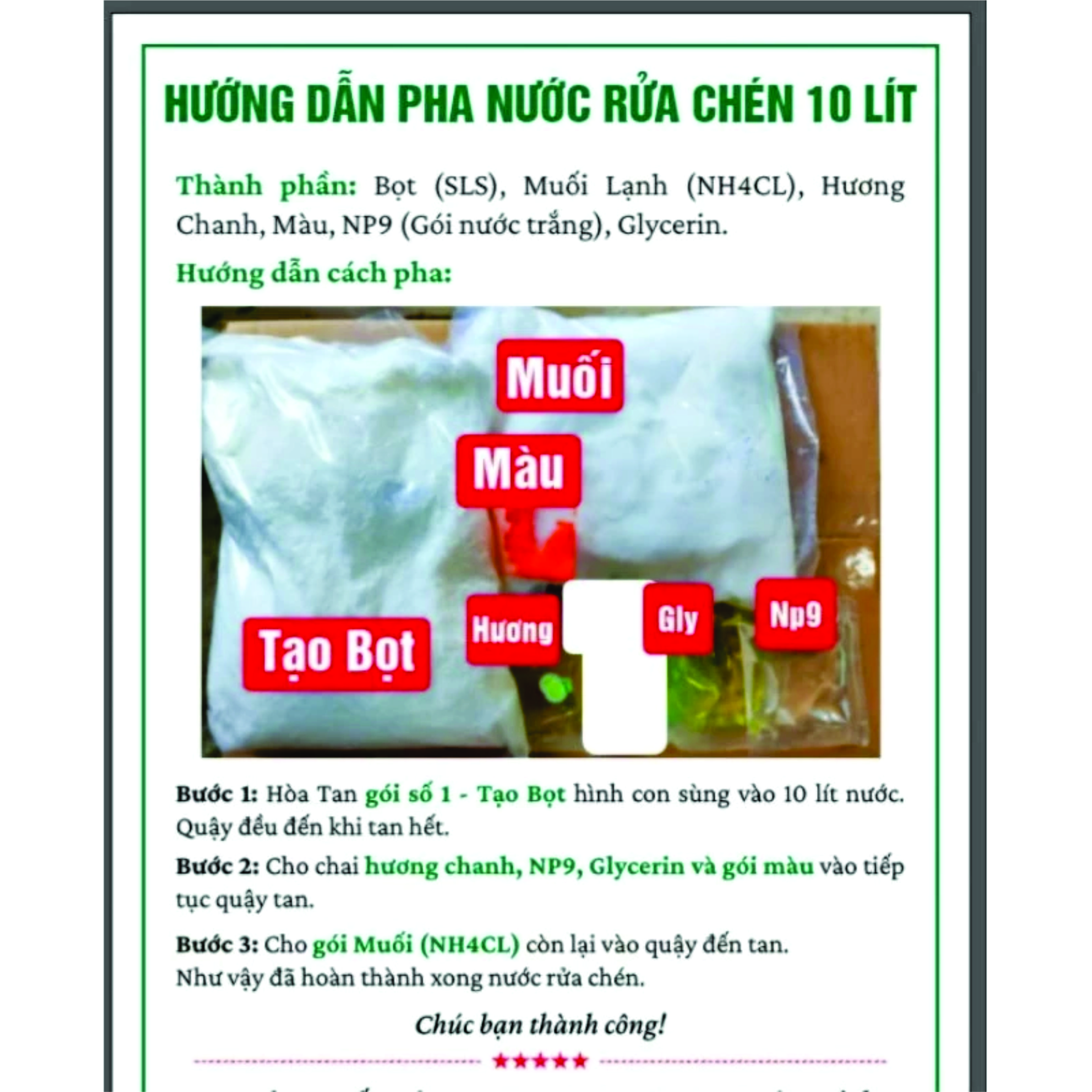 Với combo pha 10lít nước rửa chén, chỉ mất 5p để pha. Sản phẩm nước rửa chén sẽ không quá đặc, nếu muốn đặc hơn hãy mua thêm bột tạo đặc trong shop nhé.