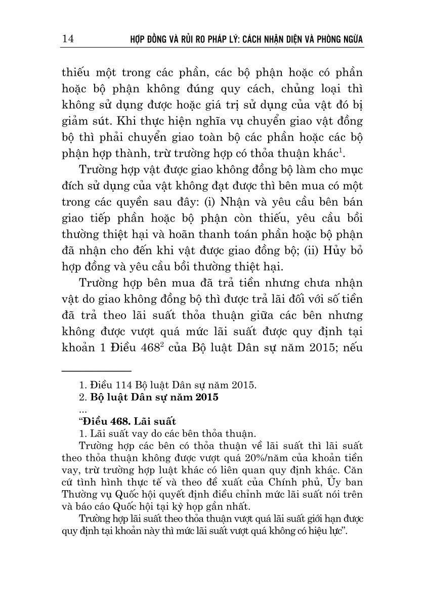 Nhằm giúp bạn đọc có được các thông tin hữu ích về vấn đề trên, Nhà xuất bản Chính trị quốc gia Sự thật xuất bản cuốn sách Hợp đồng và rủi ro pháp lý: Cách nhận diện và phòng ngừa, do Luật sư Trương Ngọc Liêu biên soạn. Cuốn sách trình bày những quy định về các loại hợp đồng thông dụng (hợp đồng mua bán, tặng cho, vay mượn, ủy quyền tài sản,...), các loại hợp đồng đặc thù (hợp đồng liên quan đến bất động sản, bảo hiểm); phân tích và làm rõ những rủi ro phát sinh thường gặp, đưa ra một số biện pháp kiểm soát, phòng ngừa rủi ro khi soạn thảo, ký kết hợp đồng.