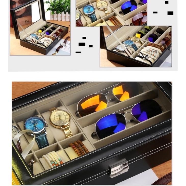 Hộp thiết kế sang trọng, cao cấp, chắc chắn với 6 ngăn đựng đồng hồ và 3 ngăn đựng kính mắt