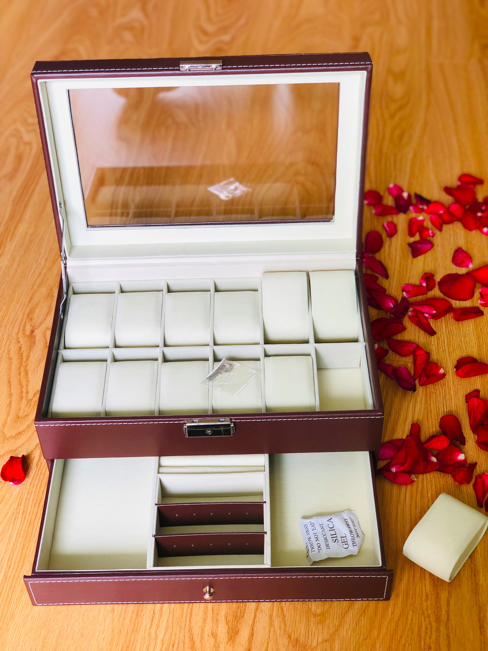 • Hộp có nắp kính, tầng trên có khóa, có sẵn cục mút để đồng hồ, tầng dưới kiểu ngăn kéo đựng trang sức, mắt kính..