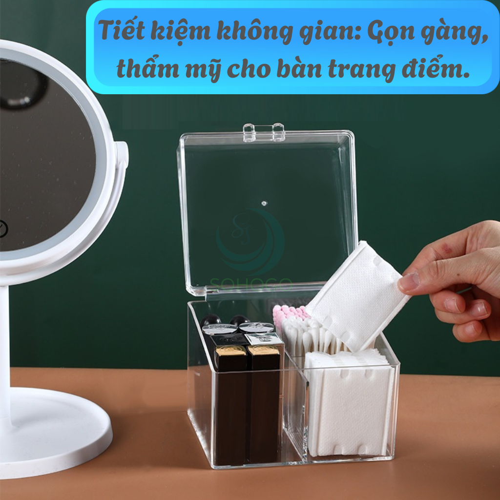 Hộp đựng mỹ phẩm đa năng được làm từ nhựa trong suốt cao cấp, có nắp đậy tiện lợi giúp bảo vệ mỹ phẩm khỏi bụi bẩn và ẩm mốc. Thiết kế thông minh với các ngăn chia riêng biệt cho phép bạn dễ dàng sắp xếp và bảo quản nhiều loại mỹ phẩm như son môi, mút trang điểm, bông tẩy trang... Hộp nhỏ gọn, dễ đặt trên bàn trang điểm hoặc mang theo khi đi du lịch.