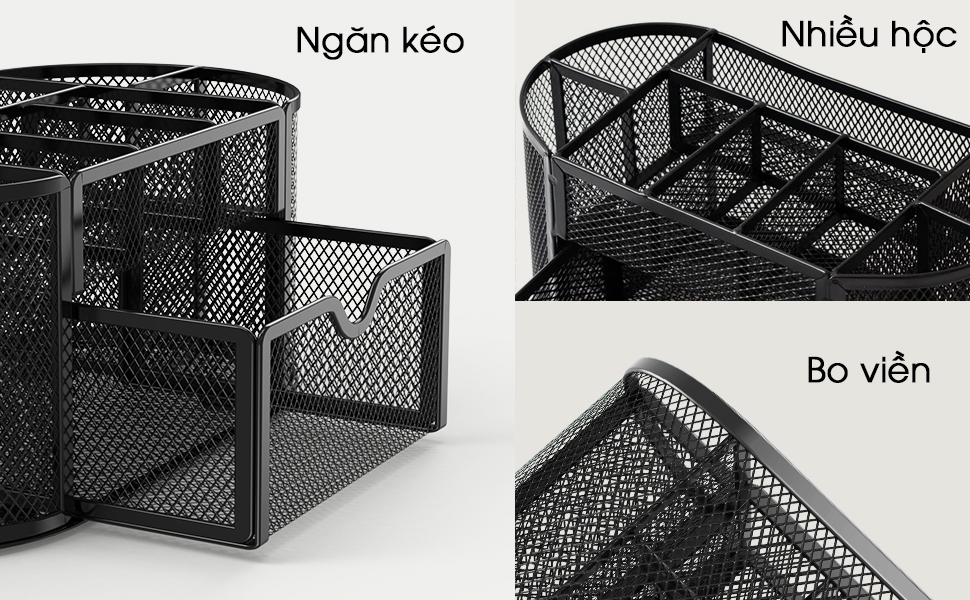 Công dụng: Thiết kế thông minh, nhiều ngăn giúp bạn để các vật dụng văn phòng một cách gọn gàng, phí dưới có ngăn kéo tiện lợi Được làm bằng kim loại dày dặn; cứng cáp; bền đẹp cho thời gian sử dụng dài lâu. Thẩm mỹ cao, phù hợp trang trí, làm quà tặng