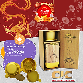 SẢN PHẨM GỒM: - 1 hộp quà: túi cà phê chồn 500g + 1 phin cafe màu anod đẹp - 1 hộp cà phê chồn phin giấy (10 túi x 15g) - 1 hộp cà