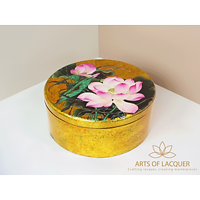 Mua tại TiktokHộp tròn đựng trong hình là "Hộp Tròn Sơn Mài Hoa Sen Hồng Dát Vàng" từ Arts of Lacquer. Hộp có thiết kế tròn với nền màu vàng, được trang trí họa tiết hoa sen hồng tinh tế, mang lại cảm giác sang trọng và nghệ thuật.