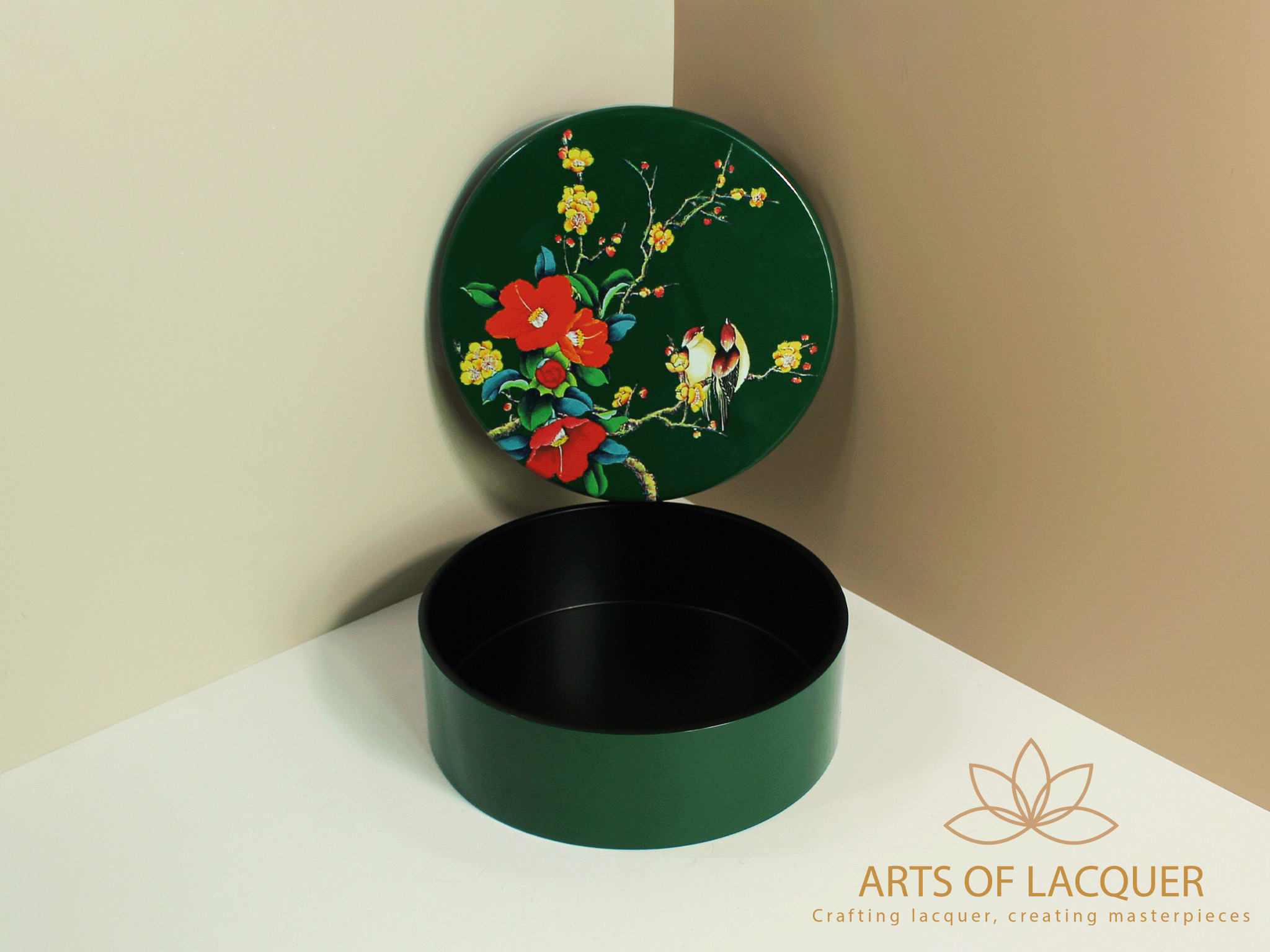 Hộp tròn đựng trong hình là "Hộp Tròn Sơn Mài Họa Tiết Chim Hoa Xanh Đậm" từ Arts of Lacquer. Hộp có thiết kế tròn với nền màu xanh lá cây đậm, được trang trí