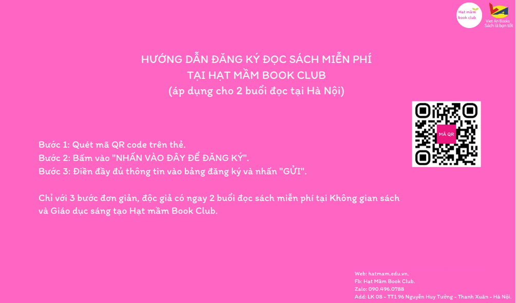Để kích hoạt được thẻ đoc tại HẠT MẦM BOOK CLUB sau khi mua HỘP YÊU THƯƠNG 3 độc giả bấm vào mã QR code hiển thị trên phần hình ảnh để đăng ký thông tin và thời gian cụ thể. Trường hợp không được, độc giả inbox trực tiếp vào gian hàng Việt An Books trên tiki để xác nhận thông tin chính xác và kịp thời.