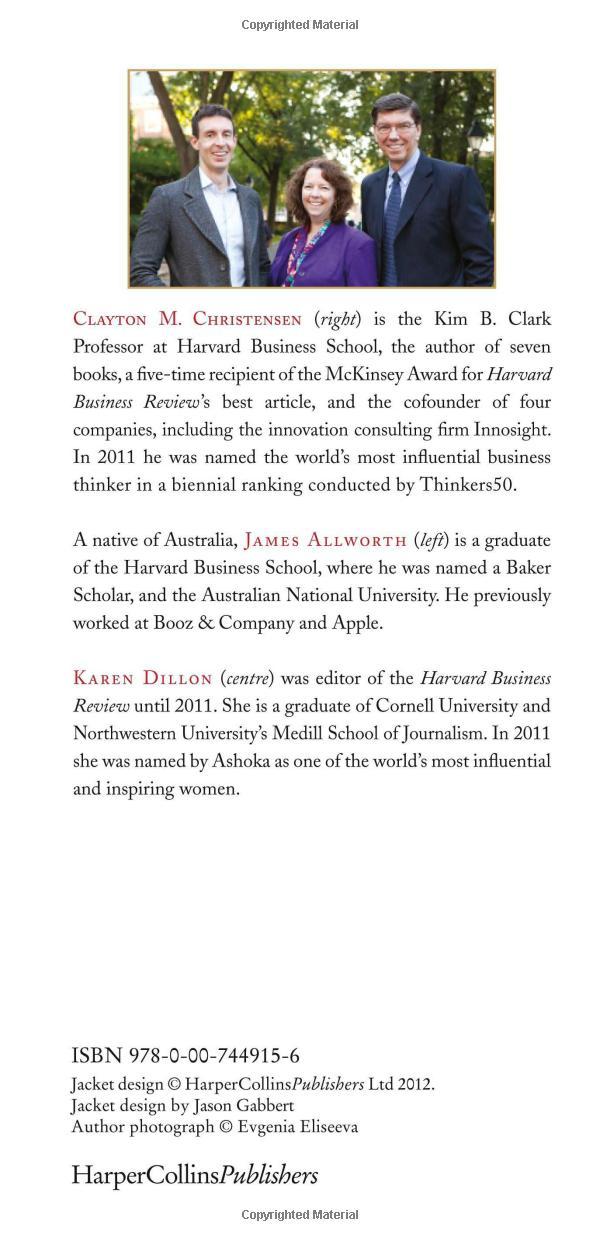 In this groundbreaking book, Christensen puts forth a series of questions: How can I be sure that I'll find satisfaction in my career? How can I be sure that my personal relationships become enduring sources of happiness? How can I avoid compromising my integrity-and stay out of jail? Using lessons from some of the world's greatest businesses, he provides incredible insights into these challenging questions.