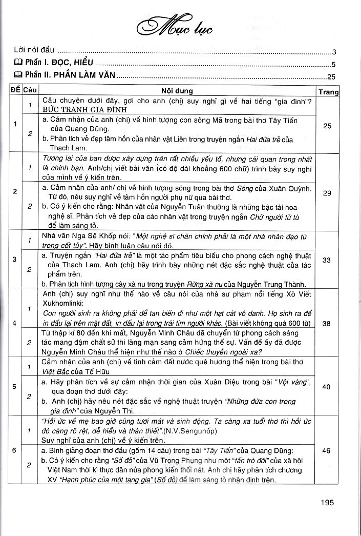 Mua tại TiktokĐây là cuốn sách được biên soạn theo tinh thần thi mới của Bộ Giáo dục và Đào tạo, theo cấu trúc đề thi 3 phần: Kiểm tra kiến thức (câu 1); Nghị luận xã hội (câu 2); Nghị luận văn học (câu 3a và 3b).