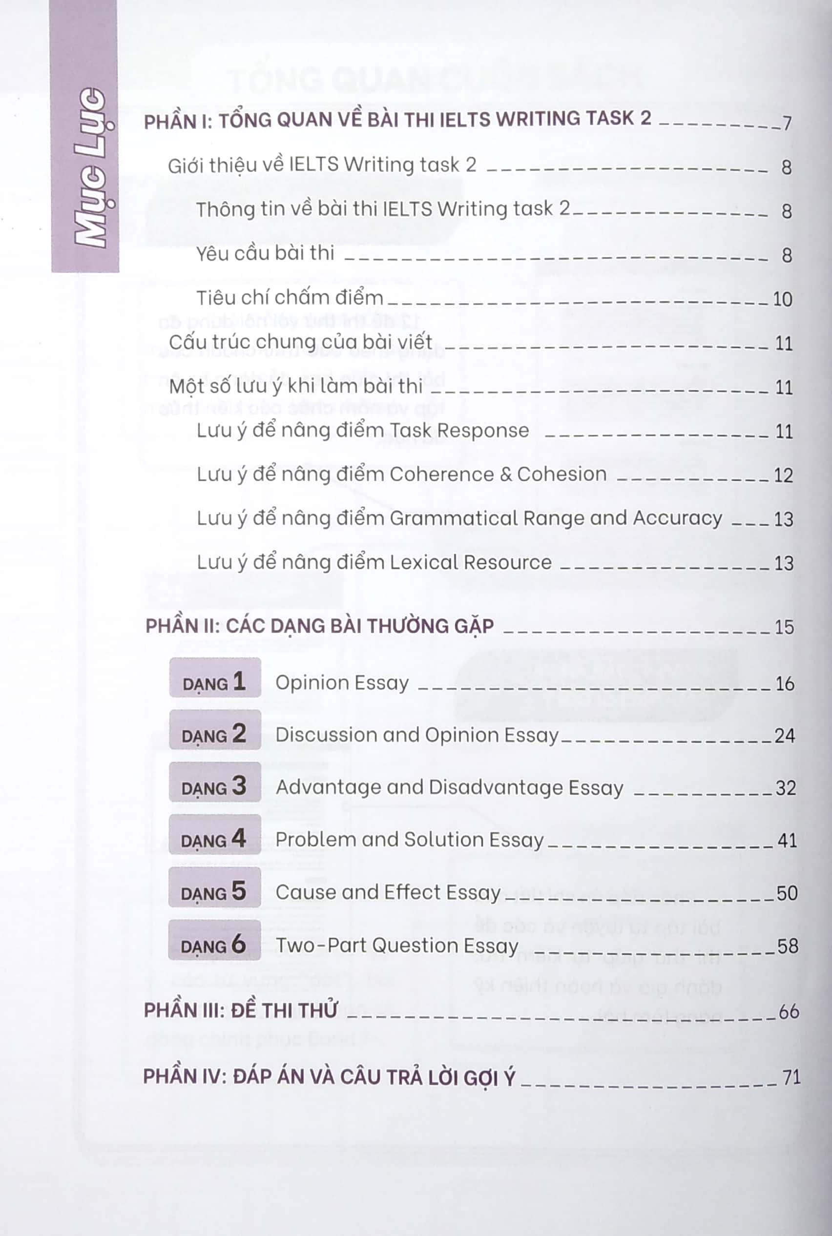 Phần này sẽ phân tích dàn ý và bài văn mẫu của 6 dạng bài phổ biến trong bài thi IELTS Writing task 2. Ngoài ra cuốn sách còn cung cấp các cấu trúc gợi ý, các từ vựng “đắt” cùng bài tập tự luyện giúp bạn dễ dàng chinh phục Band 7+.