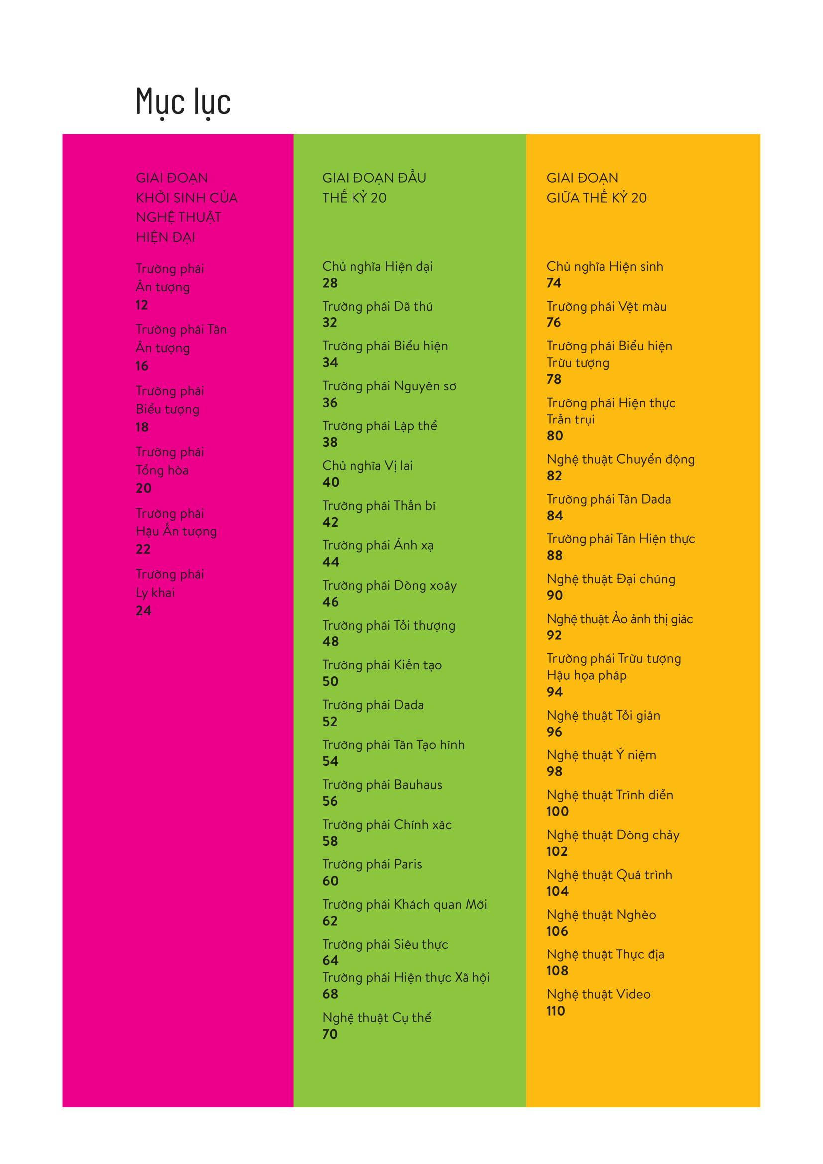 Cuốn sách này là một cẩm nang ngắn gọn giới thiệu cho bạn đọc về 55 trào lưu, trường phái và phong cách thịnh hành từ thời kỳ bình minh hé sáng của nghệ thuật hiện đại cuối thế kỷ 19 cho đến nay, nhằm giúp các bạn làm quen và tiếp cận được một nhánh của dòng chảy lịch sử nghệ thuật.