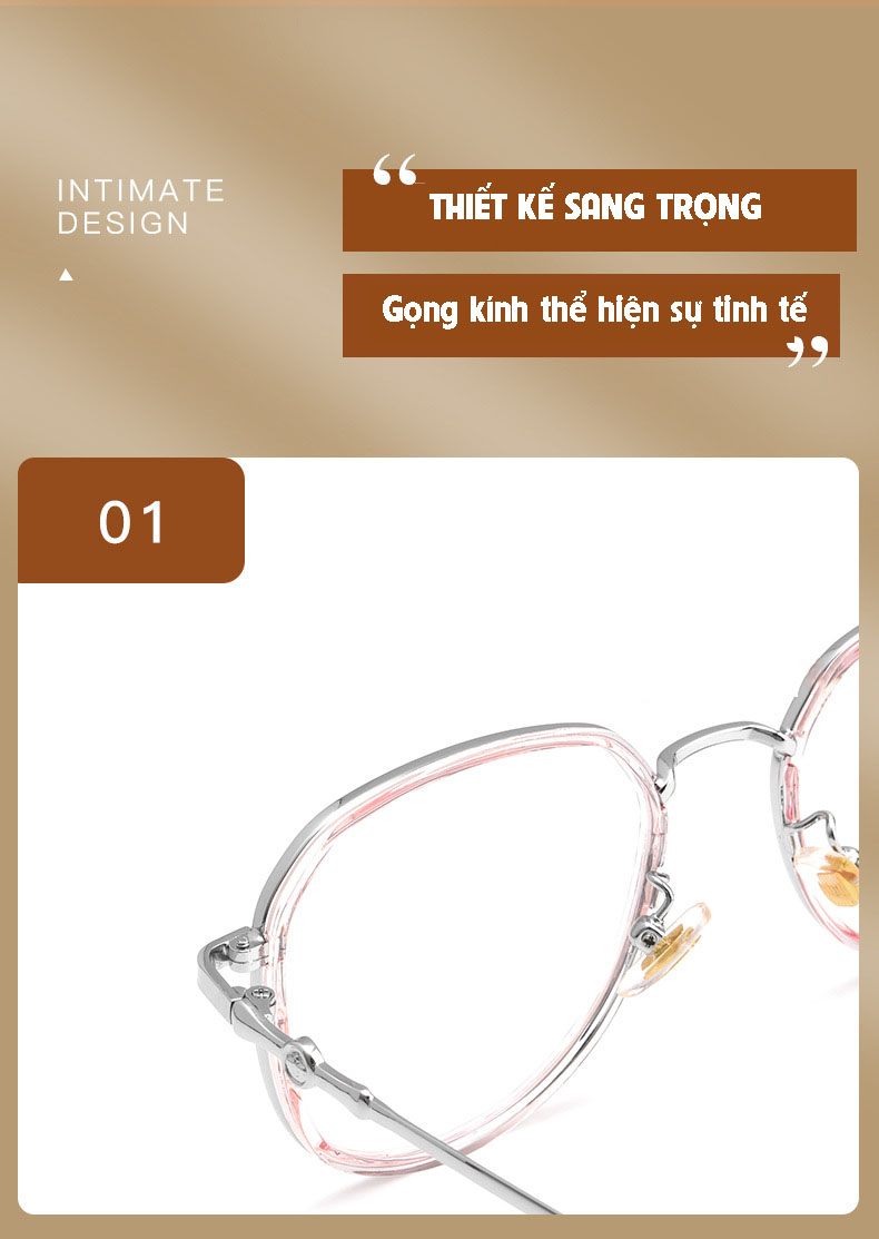 Kiểu dáng gọng kính thanh lịch, dễ đeo, phù hợp với mọi khuôn mặt nam và nữ.