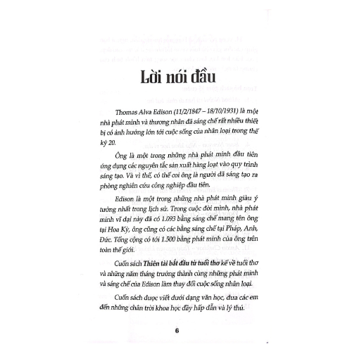Cuốn sách gồm những câu chuyện viết về cuộc đời của nhà sáng chế thiên tài Thomas Alva Edison. Ông là một trong những nhà phát minh giàu ý tưởng nhất trong lịch sử nhân loại, có tổng cộng đến 1.500 phát minh được cấp bằng sáng chế - một tượng đài khổng lồ.