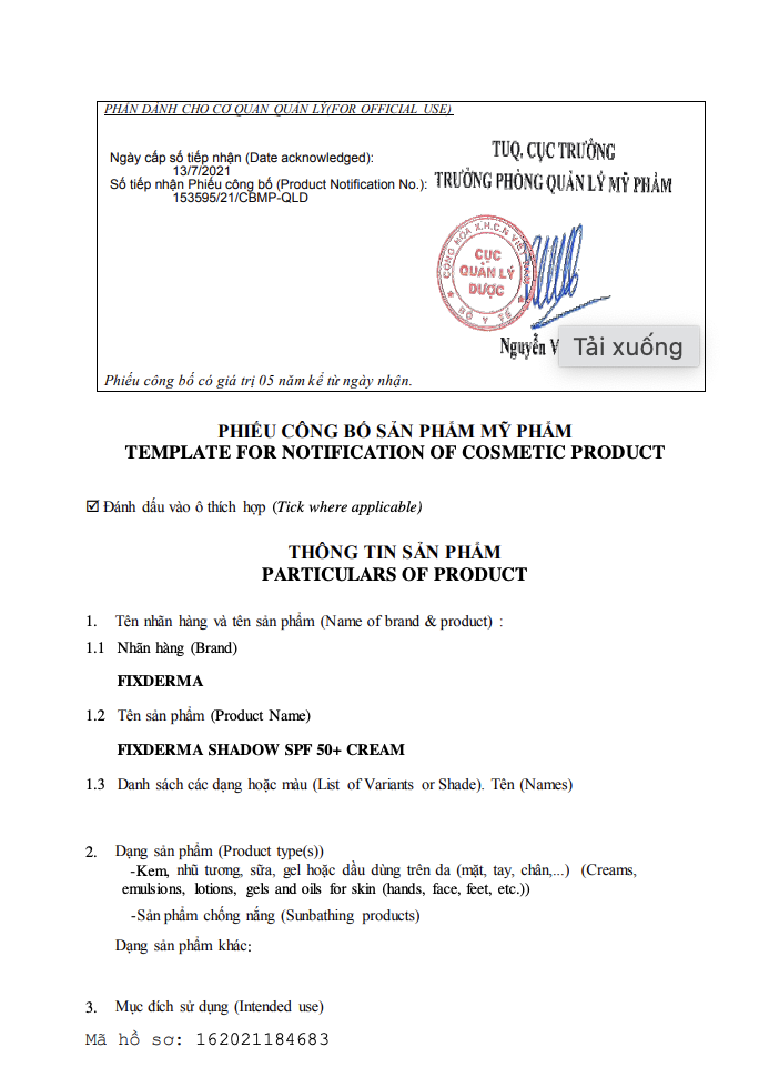 Kem chống nắng FIXDERMA SHADOW SPF 50+ Cream là gì? Fixderma Shadow SPF 50+ Cream giúp chống nắng và dưỡng ẩm, giúp bảo vệ da trước tác hại của ánh nắng mặt trời.   Thành phần Kem chống nắng FIXDERMA SHADOW SPF 50+ Cream Aqua, Octinoxate, Titanium Dioxide, Butyl Methoxydibenzoylmethane, Benzophenone-4, Caprylic/Capric Triglyceride, Propylene Glycol, Glycerol, Steareth-2, Acrylates Copolymer, Aluminum Hydroxide, Stearic Acid, Cetearyl Alcohol, Steareth-21, Phenoxyethanol, Ethylhexylglycerin, Nicotinamide, Triethanolamine, Acrylates/C10-30 Alkyl Acrylate Crosspolymer, Acrylates Copolymer, Tocopheryl Acetate, Disodium EDTA, Fragrance.   Thành phần nổi bật 1. Titanium Dioxide (Micronized): Chất chống nắng vật lý Bảo vệ da khỏi bức xạ UVA và UVB Không gây kích ứng da Dùng cho da nhạy cảm, dễ mẩn đỏ Sử dụng được cho vùng da quanh mắt 2. Benzophenone – 4: Hấp thụ cả UVA và UVB giúp lọc ra các tia UV có hại Không xâm nhập quá sâu vào da 3. Octinoxate: Là hoạt chất chống nắng lâu đời và phổ biến nhất được sử dụng để bảo vệ da, chủ yếu chống lại tia UVB Hấp thụ bức xạ UVB ở bước sóng 280-320 nm Bảo vệ da khỏi tác hại của tia UVB 4. Avobenzone: Ngăn chặn tia UVA và UVB Bảo vệ da khỏi tác động của ánh nắng mặt trời Công dụng Kem chống nắng FIXDERMA SHADOW SPF 50+ Cream Chống nắng và giữ ẩm, giúp bảo vệ da trước tác hại của ánh nắng mặt trời. Cách dùng Kem chống nắng FIXDERMA SHADOW SPF 50+ Cream   Đối tượng sử dụng: Thích hợp sử dụng cho tất cả mọi loại da, kể cả da nhạy cảm.   Cách sử dụng: Thoa kem 15-30 phút trước khi ra nắng. Sau các hoạt động thể chất như bơi lội,... Hoặc đổ nhiều mồ hôi thì có thể thoa thêm theo nhu cầu. Sản phẩm dùng toàn thân.   Lưu ý Ngưng sử dụng và báo cho bác sĩ hoặc nhân viên y tế khi có xảy ra dị ứng với bất kỳ thành phần nào của sản phẩm. Để xa tầm tay trẻ em.   Thông tin sản phẩm - Bảo quản: Giữ sản phẩm ở nơi khô và mát dưới 30 độ C. Tránh làm đông lạnh. - Hạn sử dụng: 30 tháng kể từ ngày sản xuất. - Quy cách đóng gói: Hộp 1 tuýp 75g - Thương hiệu: Fixderma - Tên nhà sản xuất: Fixderma India (P) Ltd, F-170 EPIP RIICO Industrial Area, Neemarana Distt. Alwar, Rajasthan, India. - Công ty chịu trách nhiệm về SP và phân phối: Công ty TNHH Thương mại Và Dược phẩm Hùng Lợi, 306/19 Đặng Thùy Trâm, Phường 13, Quận Bình Thạnh, Thành phố Hồ Chí Minh. - Số Giấy XNQC: 35/2022/XNQC-YTHCM -Số Giấy công bố: 153595/21/CBMP-QLD
