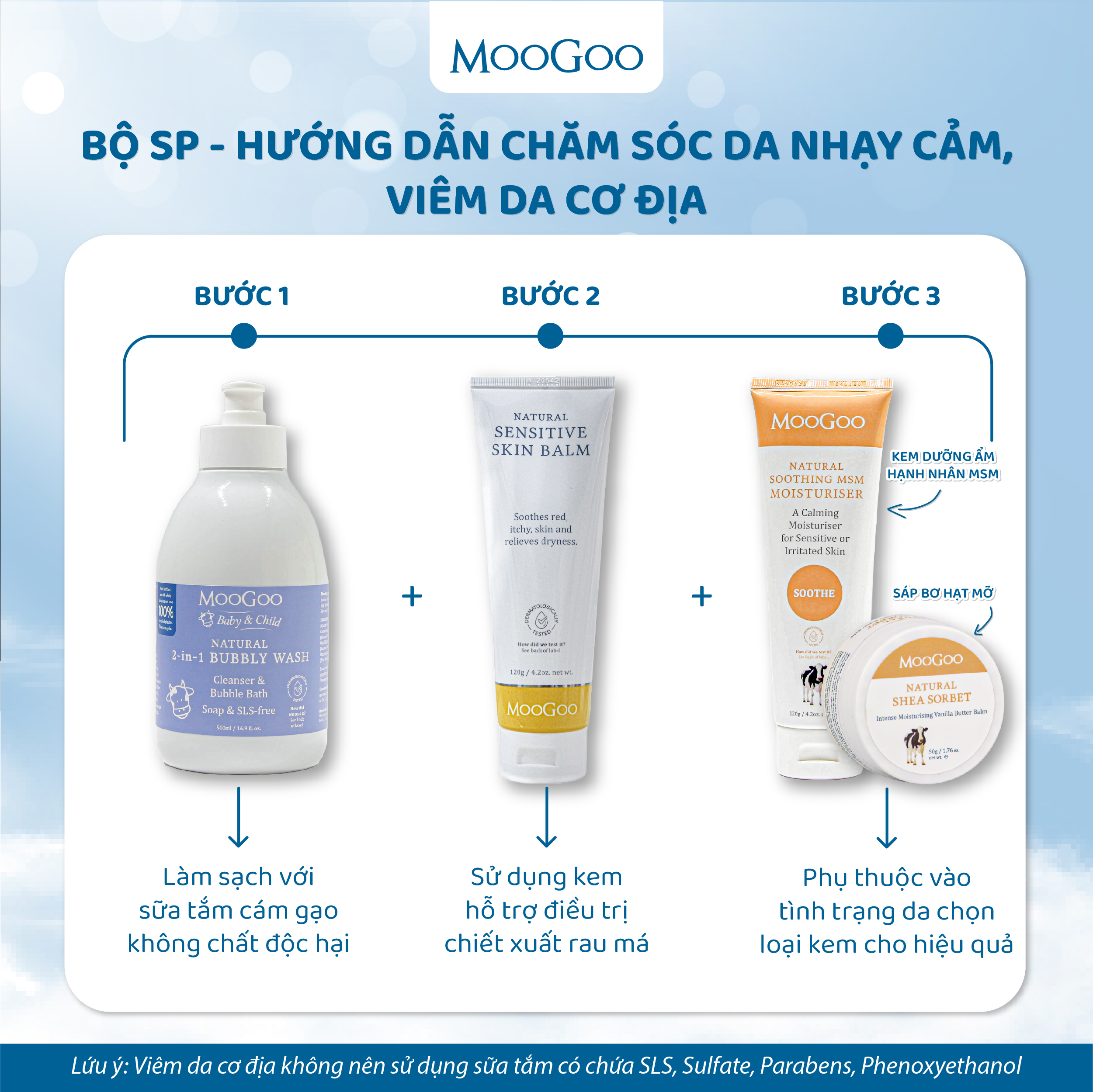 Được bảo quản tự nhiên với chiết xuất hoa bia - KHÔNG chứa Paraben và Phenoxyethanol 2, THÔNG TIN SẢN PHẨM: Trọng lượng: 120gr Giá: 348.000 VND Hũ (chai): Tuýp Kết cấu: Kem Xuất xứ: Australia Một loại kem dưỡng ẩm đặc biệt, dành riêng cho những làn da nhạy cảm. Chúng tôi thấu hiểu rõ nỗi đau đáng buồn mà những người sở hữu làn da nhạy cảm phải đối mặt khi mà mọi tác động từ bên ngoài có thể khiến da trở nên kích ứng. Kem dưỡng da nhẹ nhàng này được tạo nên từ những thành phần của Kem Dưỡng Full Cream của MooGoo, với thành phần giàu axit béo thiết yếu cho sự khỏe mạnh của làn da và được được sử dụng cho những làn da dễ bị kích ứng. Ngoài ra, chúng tôi còn bổ sung thêm lượng lớn MSM (Lưu huỳnh hữu cơ) và loại bỏ Protein Sữa. Kem dưỡng ẩm này còn chứa nhiều thành phần khác nhau giúp làm dịu da. Đặc biệt, nó phù hợp với mọi người và mọi loại da, bao gồm cả trẻ sơ sinh. Bạn có thể thoa kem này lên da bất cứ khi nào bạn muốn, bao gồm cả da mặt. 3, THÀNH PHẦN Thành phần chi tiết: Nước (H2O), Dimethyl Sulfone (Lưu Huỳnh Hữu Cơ MSM), Dầu Hạnh Nhân (Prunus Amygdalus Dulcis), Dầu Dừa (Cocos Nucifera), Cetearyl Alcohol (Sáp nhũ hóa từ thực vật) (và) Polysorbate 60 (Dầu nhũ hóa), Glyceryl Stearate SE (Nhũ hóa từ thực vật), Olea Europaea (Dầu ô liu), Tinh chất Lô Hội (Aloe Vera), Squalane (Olive), Piroctone Olamine (Olamine Salt), Guar Hydroxypropyltrimonium Chloride (Guar Gum), Mật ong, Allantoin, Acetum (Giấm táo), Chiết xuất từ Pyrus Communis (Lê), Hương vani tự nhiên, Tocopherol (Vitamin E tự nhiên), Chiết xuất Humulus Lupulus (Hoa bia). MooGoo luôn luôn có triết lý nghiêm ngặt về thành phần của sản phẩm. Thân thiện với môi trường và KHÔNG chứa các chất độc hại như Paraben, Parafin, dầu khoáng, thành phần gốc silicone, chất gây kích ứng Phthalate và Phenoxyethanol và các chất tăng cường thẩm thấu. 4, HƯỚNG DẪN SỬ DỤNG Sử dụng kem dưỡng ẩm hàng ngày sau bước làm sạch da để giữ cho làn da của bạn luôn mềm mại và đầy đủ độ ẩm. 5, BẢO QUẢN