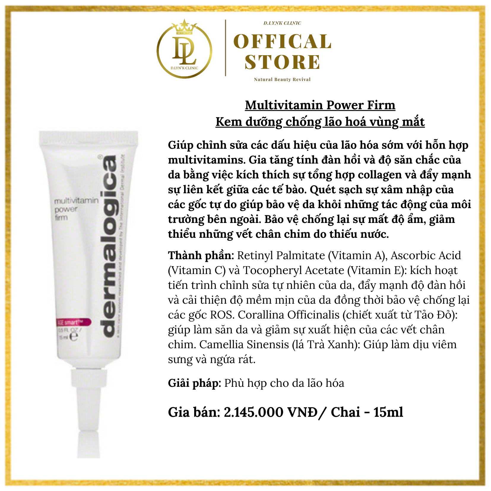 Mua tại TiktokKem dưỡng chống lão hóa vùng mắt Dermalogica Multivitamin Power Firm 15ml Multivitamin Power Firm giúp chỉnh sửa các dấu hiệu của lão hóa sớm với hỗn hợp MultiVitamin. Gia tăng tính đàn hồi và độ săn chắc của da bằng việc kích thích sự tổng hợp collagen và đẩy mạnh sự liên kết giữa các tế bào. Quét sạch sự xâm nhập của các gốc tự do giúp bảo vệ da khỏi những tác động của môi trường bên ngoài. Bảo vệ chống lại sự mất độ ẩm, giảm thiểu những vết chân chim do thiếu nước. THÔNG TIN SẢN PHẨM