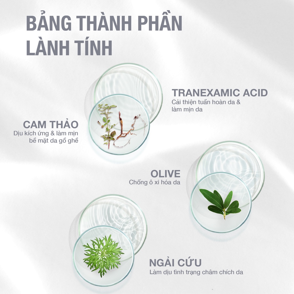 - Hai hoạt chất tranexamic acid và dipotassium glycyrrhizinate khóa ẩm, giữ ẩm cho da, giúp da luôn ẩm mịn khi sử dụng liên tục.