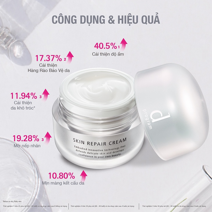 - Kem Dưỡng D Program Phục Hồi Da 45g giúp khóa ẩm sâu vào lớp sừng của da, giúp bề mặt da không bóng nhờn và ẩm mượt, giúp giảm sự xuất hiện của đường nhăn và nếp nhăn do khô da.