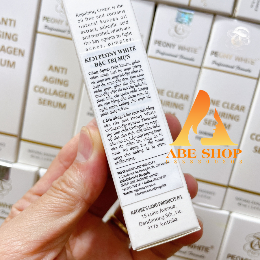 Kem Peony White Mụn - Acne Clear Repairing Cream mang đến làn da mịn mướt, sạch các vết mụn, nôt mụn tấy đỏ. Sản phẩm dành cho các loại da mụn đầu đen, da mụn cám, da mụn bã đậu, mụn mủ. Bôi Kem Peony White Mụn - Acne Clear Repairing Cream cao cấp hàng ngày bạn sẽ tạm biệt nỗi lo về mụn mà không cần phải dùng quá nhiều loại mỹ phẩm khác nhau. CÔNG DỤNG CHÍNH CỦA SẢN PHẨM: Kem Peony White Mụn - Acne Clear Repairing Cream được lòng chị em bởi loại bỏ khả năng gây mụn rất tốt. Khả năng phục hồi da bị mụn nặng , loại bỏ tình trạng gây mụn trứng cá, mụn mủ, mụn bọc, mụn đầu đen. Tinh chất lành tính trong Kem Peony White Mụn - Acne Clear Repairing Cream cũng thúc đẩy việc tái tạo lớp biểu bì, phục hồi làn da. Bạn sẽ được cải thiện chất lượng da, cân bằng lượng tiết dầu nhờn trên da, ngăn ngừa không cho mụn xuất hiện nhiều lần, tăng nhanh thời gian liền các vết ẹ do mụn để lại. HƯỚNG DẪN CÁCH SỬ DỤNG: Làm sạch da mặt bằng sữa rửa mặt Peony White Collagen mụn mỗi sáng và tối. Thoa thêm một lớp tinh chất Peony White Collagen mụn. Dùng tay vỗ nhẹ cho tinh chất thẩm thấu sâu và đều vào da. Lấy một lượng Kem Peony White Mụn - Acne Clear Repairing Cream vừa đủ chấm lên các vùng da bị mụn, hoặc dùng bông tăm chấm trực tiếp lên những vết mụn sắp và đang nổi. Sử dụng đều đặn ừ 2 - 3 lần trong ngày cho những làn da bị mụn nặng .   HƯỚNG DẪN BẢO QUẢN :