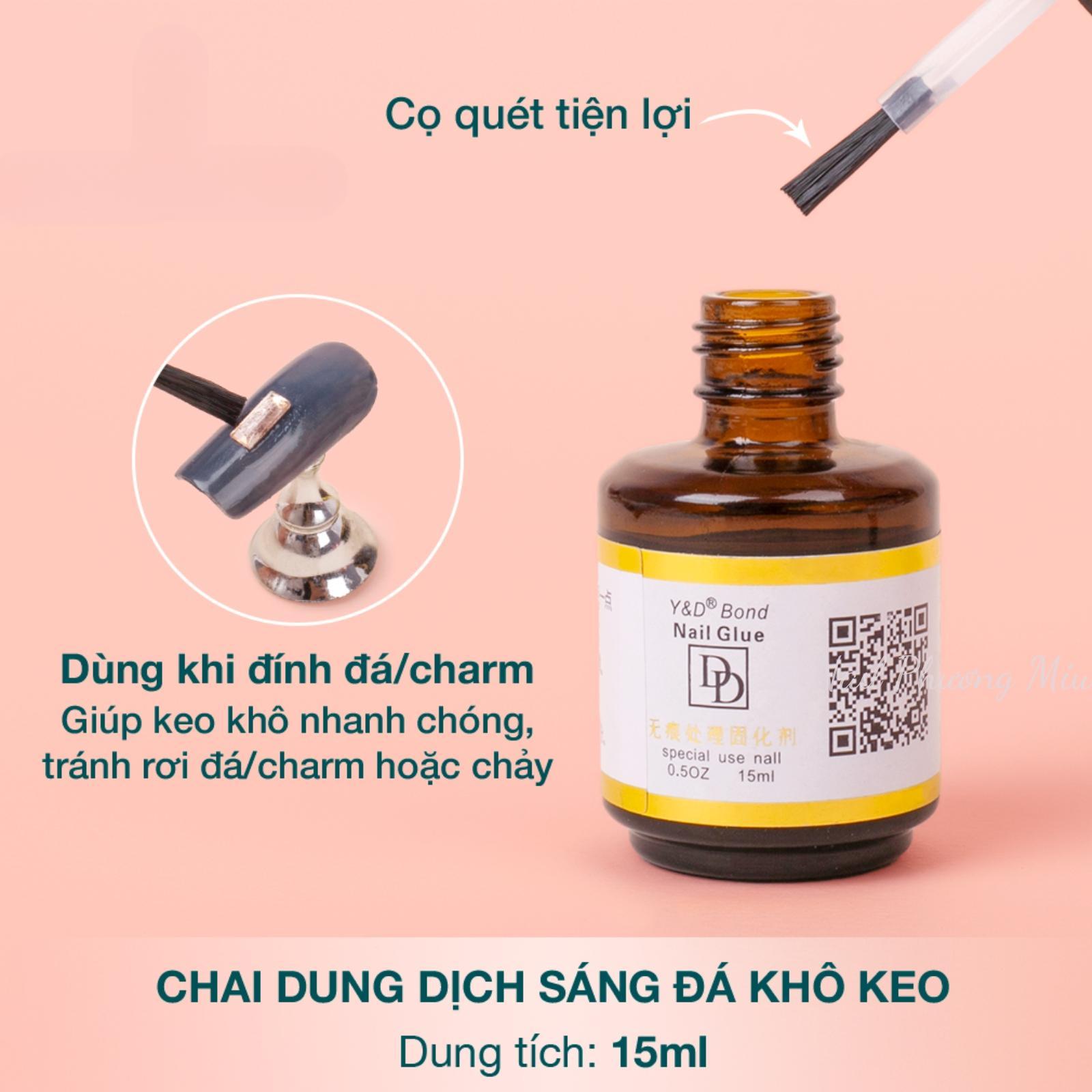 - Hướng dẫn sử dụng (cách đính đá, charm, phụ kiện):Bước 1: Dũa dày mài nhám phần móng bạn muốn đính đá, charm. Sau đó, trải một lượng keo DD vừa đủ lên toàn bộ bề mặt móng tay bạn muốn đính phụ kiện. Đặt phụ kiện trang trí lên phần đã trải gel rồi ấn chặt xuống.Bước 2: Sau khi xếp đặt các mẫu trang trí theo design, bạn dùng chai dung dịch khô keo chải đều vào các phần chân của đá, phụ kiện, charm. Phần keo đính đá sẽ khô ngay lập tức.