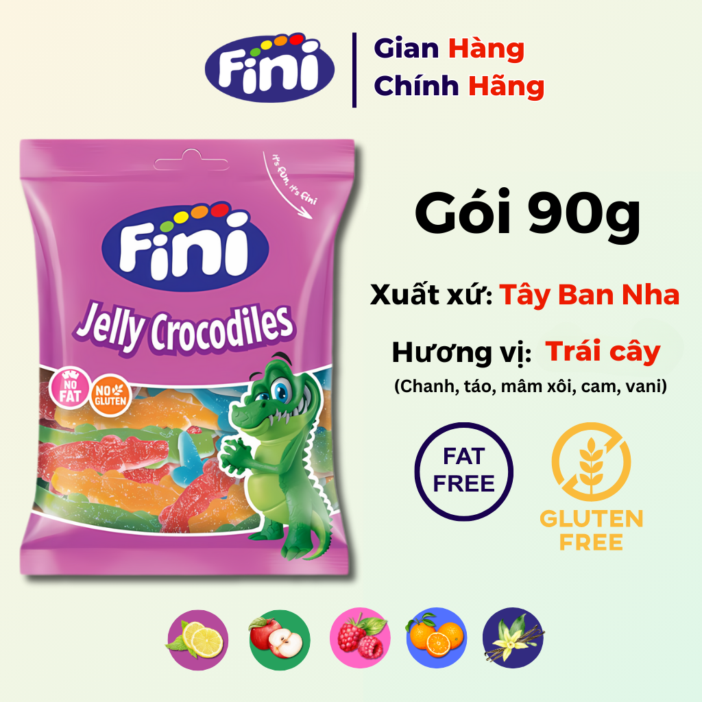 Đặc điểm nổi bật: - Vị trái cây tươi mát: Kẹo dẻo Fini Jelly Crocodiles có 5 hương vị trái cây hấp dẫn: chanh, táo, cam, mâm xôi và vani, cho bạn trải nghiệm vị