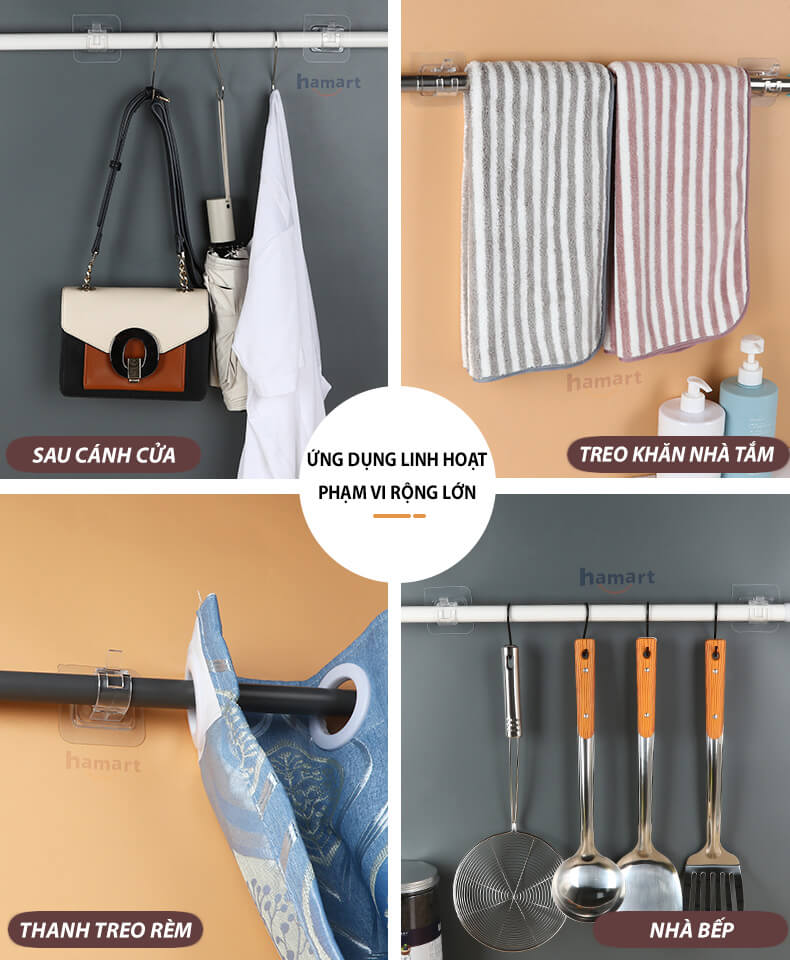 • Phạm vi sử dụng linh hoạt, rộng lớn: phòng tắm, phòng bếp, sau cánh cửa, trên cửa sổ ... ** Phù hợp với thanh treo hình trụ tròn đường kính ≤2.2cm   MÔ TẢ SẢN PHẨM: