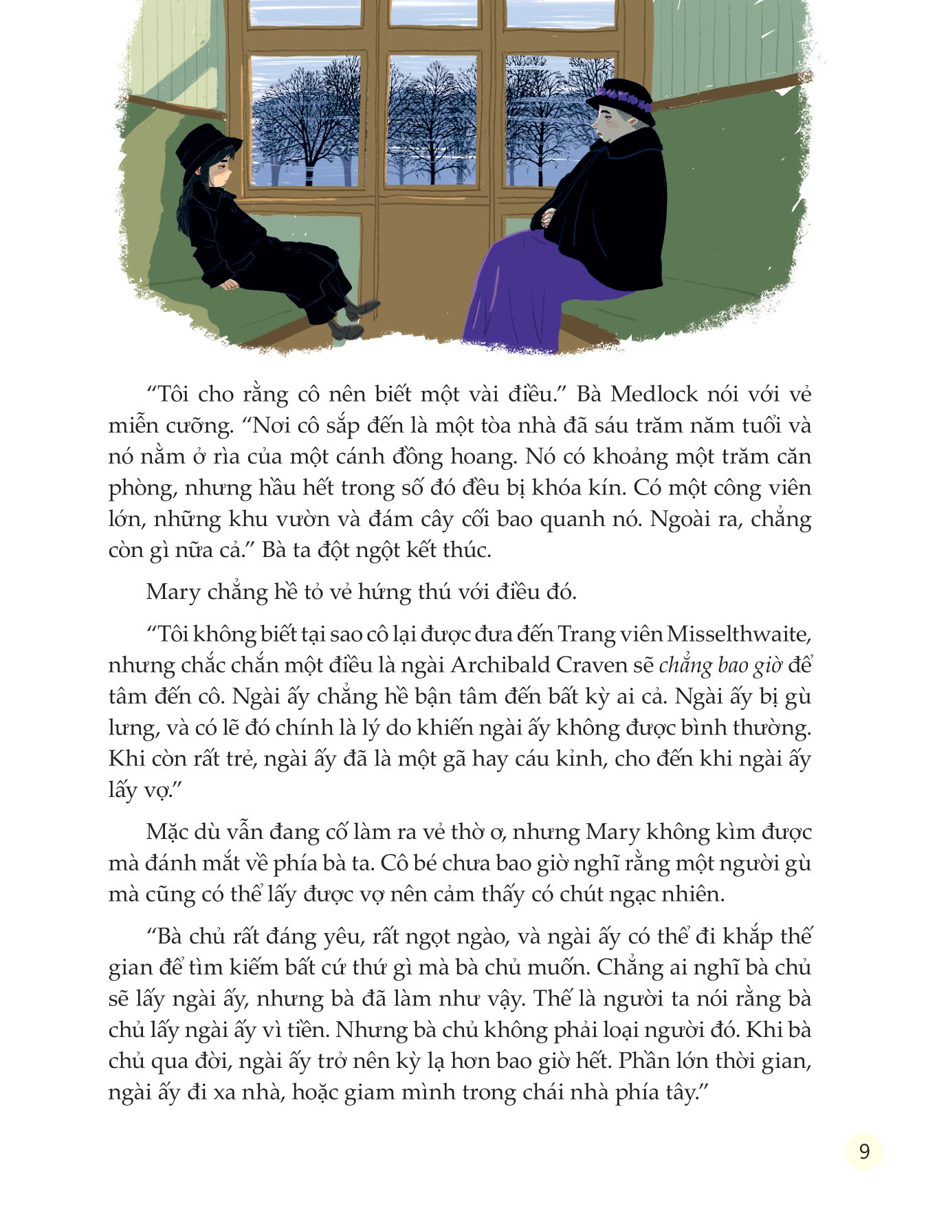 Mọi người đều nói Mary Lennox có vẻ ngoài chẳng ai ưa nổi, cái mặt gầy choắt còn biểu cảm thì cau có, khó gần. Mary sinh ra ở Ấn Độ. Cha của cô bé làm việc cho chính phủ Anh, còn mẹ cô bé là một phụ nữ vô cùng xinh đẹp, có điều dường như họ chẳng hề bận tâm đến việc nuôi dạy đứa con gái nhỏ của mình. Lúc nào Mary cũng ở cùng bảo mẫu và bị tách xa khỏi cha mẹ hết mức có thể. Mẹ của Mary không thích nghe thấy tiếng khóc của con gái mình, cho nên những người hầu trong nhà luôn cố gắng chiều theo mọi yêu cầu của cô bé. Bởi thế mà chẳng có gì đáng ngạc nhiên khi lớn lên, cô bé lại trở thành một đứa trẻ ích kỷ.