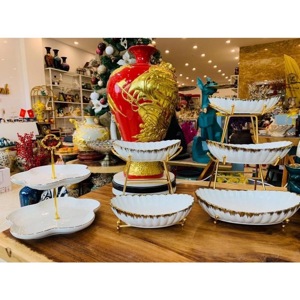 Khay đựng hoa quả, bánh kẹo, mứt Tết 2 tầng, 3 tầng bằng gốm sứ kèm đế kim loại mạ vàng cao cấp.