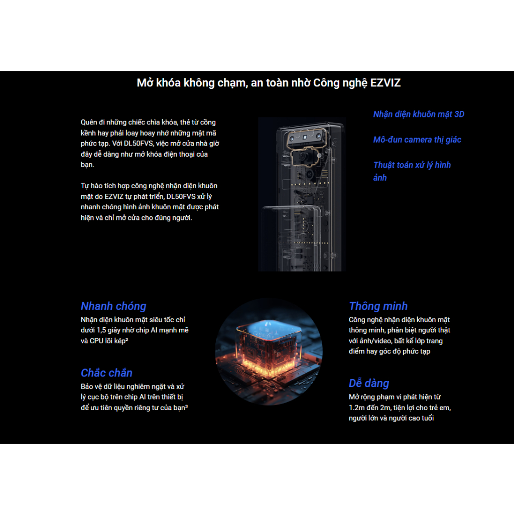 – Nhiều chế độ mở khóa: Khuôn mặt, vân tay, mật mã, chìa cơ, chìa bluetooth, qua ứng dụng EZVIZ, mã tạm thời, mở khóa từ xa