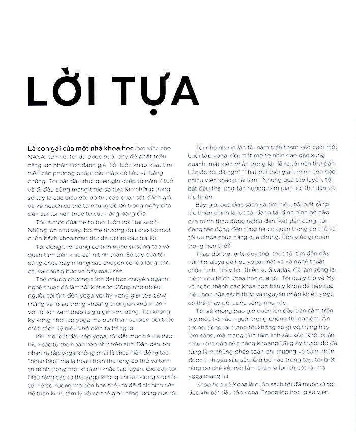 Lối sống hiện đại khiến con người dễ gặp stress và mắc các chứng bệnh thời công nghệ số như “cổ công nghệ”, “đau vai gáy”, “thoát vị đĩa đệm”… Khoa học đã chứng minh rằng yoga – các tư thế, các bài tập thở và thiền – không những giúp giải tỏa căng thẳng, giảm đau hiệu quả và chữa lành mà còn cải thiện các hệ cơ quan trong cơ thể. Với mong muốn đem đến cho mọi người cái nhìn toàn diện nhất, bao quát nhất về các giá trị thực tiễn của yoga, Khoa học về yoga đào sâu vào khía cạnh sinh lý học của hơn 30 tư thế yoga cốt lõi sau khi giới thiệu khái quát nhưng đầy thông tin về giải phẫu cơ thể. Mỗi tư thế được mô tả cặn kẽ và khoa học, từ mọi góc độ – cơ, xương, khớp – mang lại một hình dung cụ thể về cơ thể giúp các yogi tự tin thực hành và kiểm soát tốt tư thế, tránh gặp phải các chấn thương và tối ưu hóa hiệu quả của thực hành yoga.