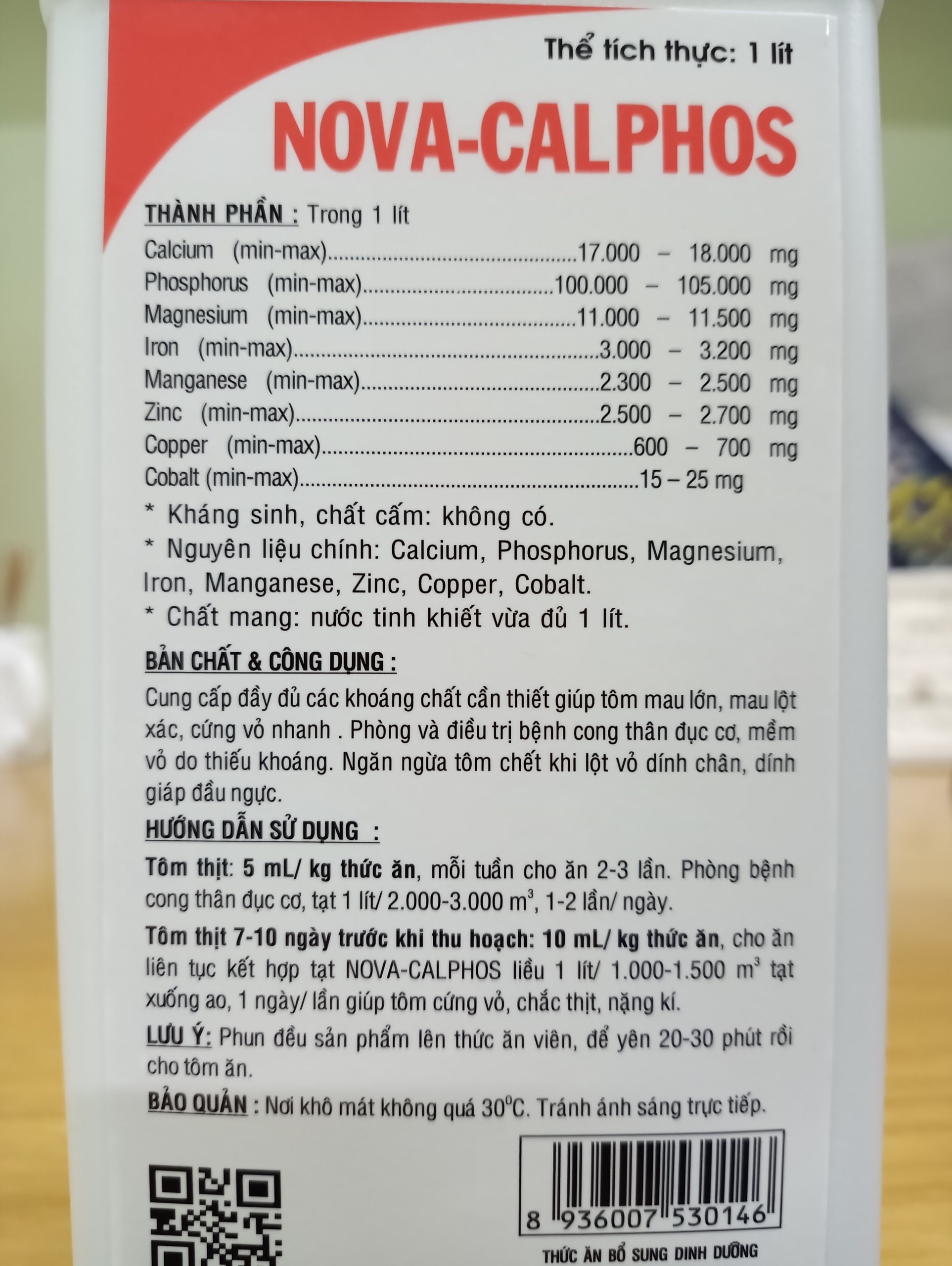 • NOVA-CALPHOS được thiết kế theo công thức hoàn hảo, cung cấp đầy đủ cho các khoáng chất cần thiết giúp tôm mau lớn, mau lột xác, cứng vỏ nhanh. Phòng và điều trị bệnh cong thân, đục cơ, mềm vỏ do thiếu khoáng. Ngăn ngừa tôm chết do dính vỏ, dính giáp đầu ngực.
