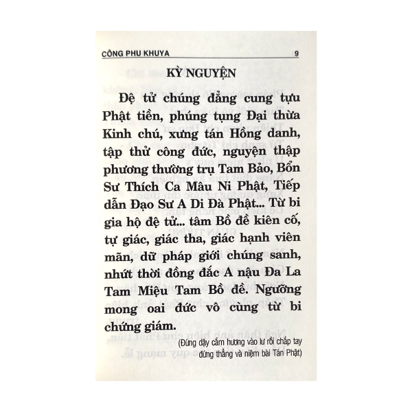 KINH NHẬT TỤNG (KHỔ NHỎ) MỤC LỤC: NGHI THỨC CÔNG PHU KHUYA NGHI THỨC CÔNG PHU CHIỀU: KINH A DI ĐÀ, HỒNG DANH SÁM HỐI, MÔNG SƠN THÍ THỰC NGHI THỨC CẦU AN NGHI THỨC TỤNG KINH KIM CANG NGHI THỨC LỄ VU LAN BỒN: KINH HẠ SANH DI LẶC THÀNH PHẬT NGHI THỨC LỄ KHÁNH ĐẢN NGHI THỨC LỄ AN VỊ PHẬT NGHI THỨC CÚNG NGỌ NGHI THỨC QUÁ ĐƯỜNG NGHI THỨC KỆ ĐẠI HỒNG CHUNG: KỆ CHUYỂN TRỐNG NGHI THỨC PHÓNG SANH CÁC BÀI SÁM: SÁM THÍCH CA, SÁM DI ĐÀ, SÁM NHỨT TÂM NGHĨA, SÁM HỐI PHÁT NGUYỆN, SÁM ĐẠI TỪ, SÁM PHÁT NGUYỆN, SÁM QUAN ÂM, SÁM NHỨT TÂM, BÀI NGUYỆN CHƯ THIÊN CÁC NGÀY LỄ KỶ NIỆM NHỮNG NGÀY TRAI
