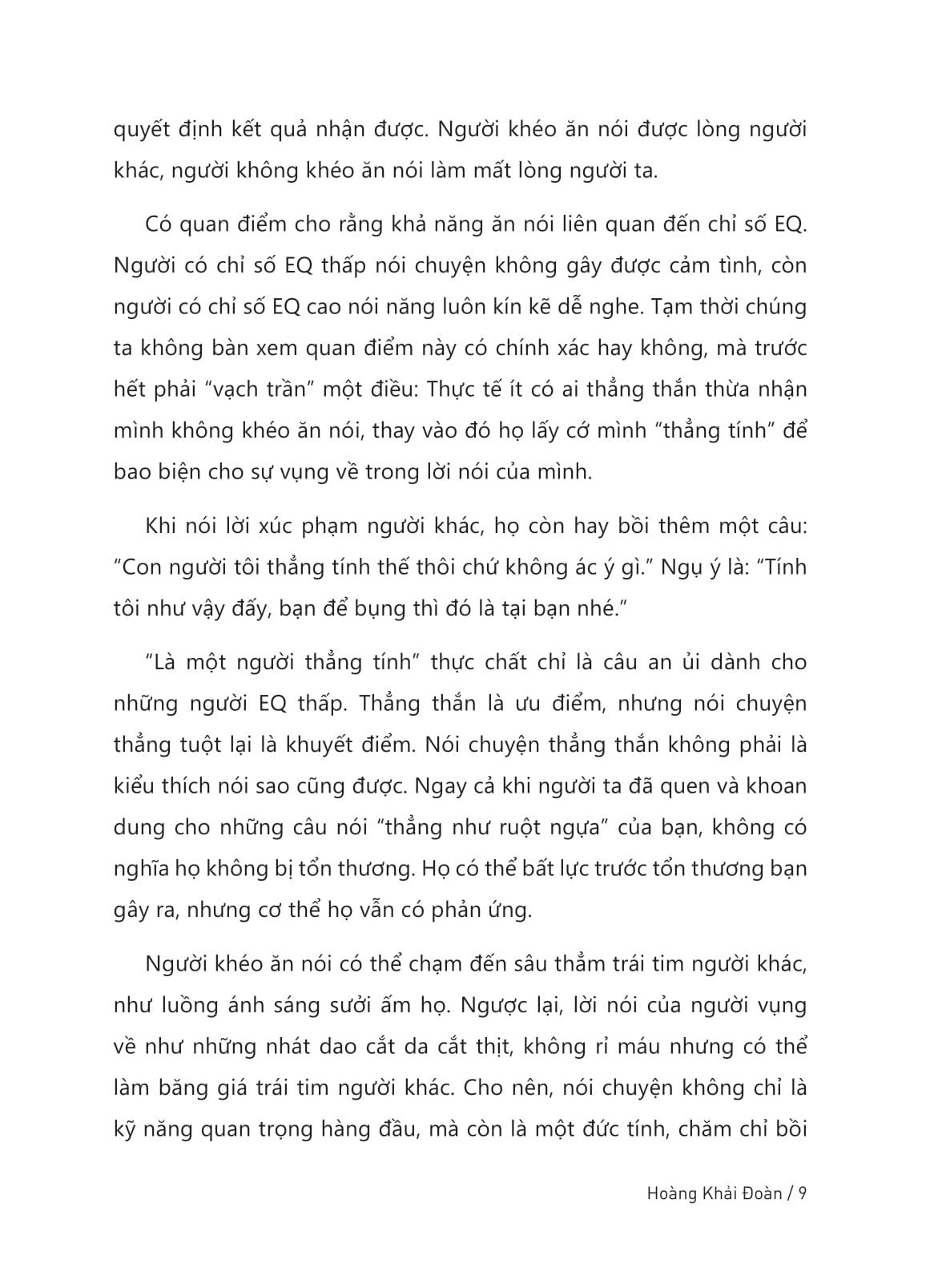 “Thẳng tính” chỉ là một từ để bao biện cho sự vụng về trong cách giao tiếp của người EQ thấp. Vậy thế nào là nói chuyện EQ cao? Hãy ghi nhớ công thức: “ngôn ngữ + tâm lý”, nắm bắt suy nghĩ của người khác, tìm ra điểm tích cực trong lời nói tiêu cực, loại bỏ khuôn khổ giới hạn trong tư tưởng... Nếu bạn có suy nghĩ “Nói chuyện khéo léo là do trời sinh”, bạn đã nhầm. Giao tiếp tốt không phải do tính cách mà là một loại kỹ năng, chỉ cần bạn bồi dưỡng, luyện tập thường xuyên là được.