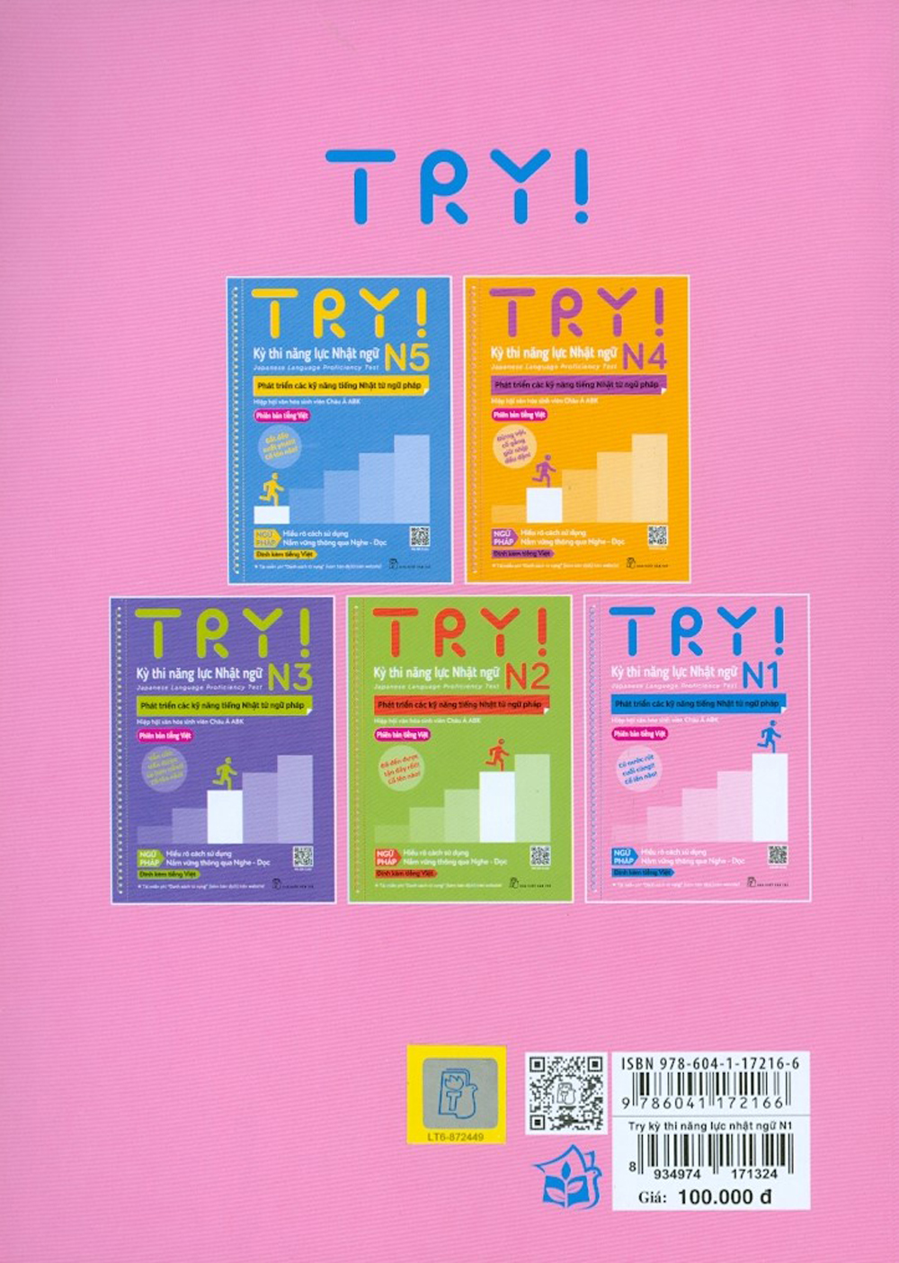 Mua tại TiktokBộ giáo trình TRY! gồm một cuốn TRY! Start cho các bạn mới bắt đầu học tiếng Nhật và 5 cuốn TRY! N1, N2, N3, N4, N5 giúp phát triển các kỹ năng tiếng Nhật thông qua việc học ngữ pháp. Bộ giáo trình này là tài liệu luyện thi thiết thực cho "Kỳ thi năng lực Nhật ngữ" các cấp độ từ N5 đến N1, giúp người học nắm chắc các điểm ngữ pháp và vận dụng chúng thông qua các bài luyện tập Nghe - Đọc.