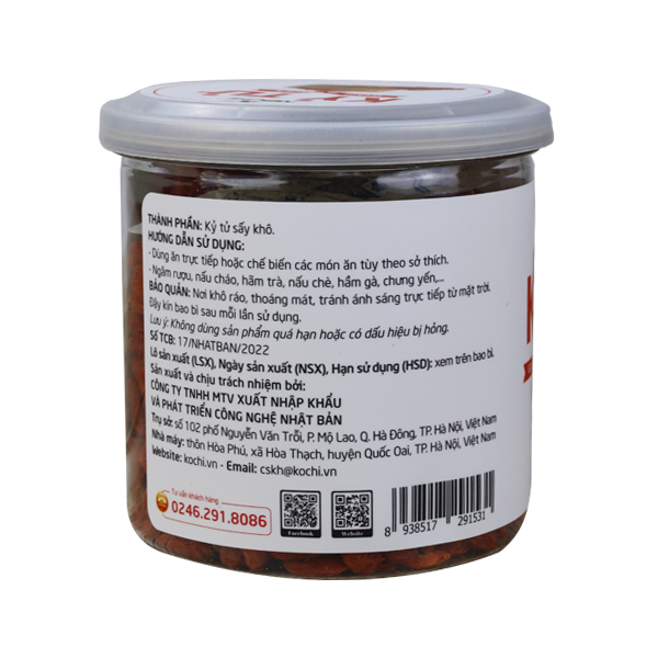 Khối lượng tịnh: 150g THÀNH PHẦN: - Kỳ tử sấy khô. HƯỚNG DẪN SỬ DỤNG: - Dùng trong trực tiếp hoặc chế biến các món ăn tùy theo sở thích. - Ngâm rượu, nấu cháo,