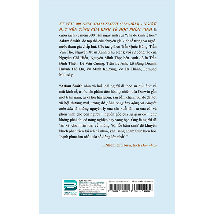 Kỷ Yếu 300 Năm Adam Smith (1723-2023) - Người Đặt Nền Tảng Của Kinh Tế Học Phồn Vinh Kỷ yếu 300 năm Adam Smith (1723-2023) - Người đặt nền tảng của kinh tế học phồn vinh là cuốn sách được ra đời để kỷ niệm 300 năm ngày sinh của “cha đẻ” kinh tế học hiện đại Adam Smith (1723-2023), do Phanbook và NXB Đà Nẵng ấn hành. Đây là quyển sách đầu tiên về diện mạo và những đóng góp của ông cho lý thuyết kinh tế thế giới, do Trần Quốc Hùng - Trần Văn Thọ - Nguyễn Xuân Xanh chủ biên, với sự cộng tác, tham gia chấp bút của Nguyễn Chí Hiếu - Nguyễn Minh Thọ - Trần Lê Anh - Nguyễn Ngọc Anh - Nguyễn Tú Anh - Lê Văn Cường - Lê Đăng Doanh - Huỳnh Thế Du - Edmund Malesky - Emily Hamblin - Vũ Minh Khương - Hoàng Hải Vân…