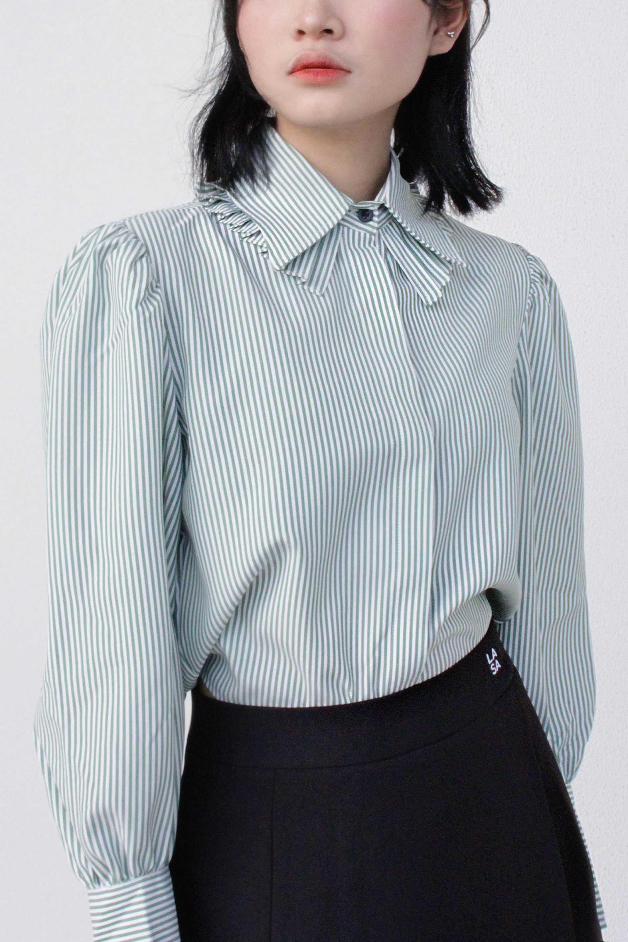 CHẤT SOMI COTTON PHA, MỀM ĐỨNG PHOM ÁO MÀU XANH LÁ SỌC TRẮNG ÁO CỔ SOMI KIỂU, TAY PHỒNG, NẸP ÁO GIẤU NÚT PHOM ÁO CROPTOP ĐIỂM NHẤN PHẦN XẾP LY Ở LÁ CỔ PHẦN