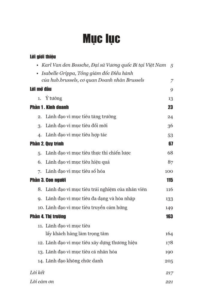 Ở mỗi chương, chúng ta sẽ nghe chia sẻ từ một công ty nổi tiếng về lý do tại sao các nhà lãnh đạo của họ lại chọn tập trung vào yếu tố đó. Họ sẽ giải thích cách họ lựa chọn và thực hiện, cách họ nhìn nhận vai trò lãnh đạo và ý nghĩa của lãnh đạo đối với tổ chức của họ.