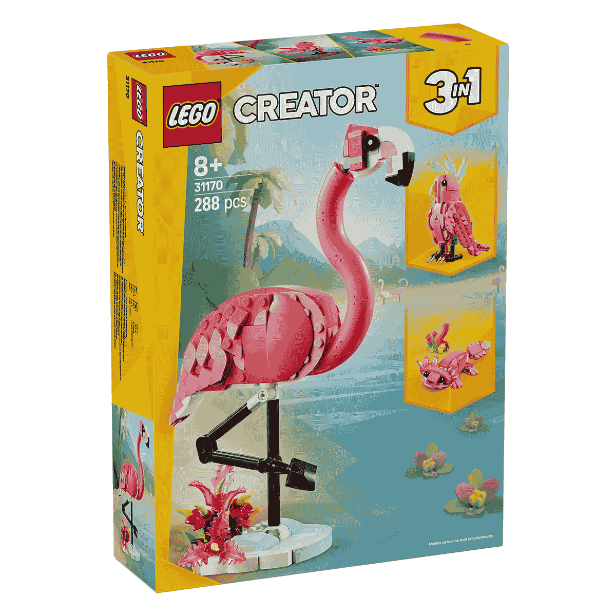 Mang vẻ đẹp và sắc màu của một hòn đảo nhiệt đới vào căn phòng của bạn với 3 loài động vật hoang dã tuyệt đẹp này! Chiêm ngưỡng chú hồng hạc hồng duyên dáng đứng bên bờ sông xanh mướt trước khi cúi xuống nhấp một ngụm nước. Để thêm phần thú vị, bạn có thể tái tạo lại nó thành một chú vẹt mào tuyệt đẹp, có thể xoay đầu 360 độ, hoặc một chú kỳ giông axolotl đáng yêu. Bạn sẽ lắp ráp gì? Lựa chọn nằm trong tay bạn với bộ đồ chơi 3trong1 đầy sáng tạo này!
