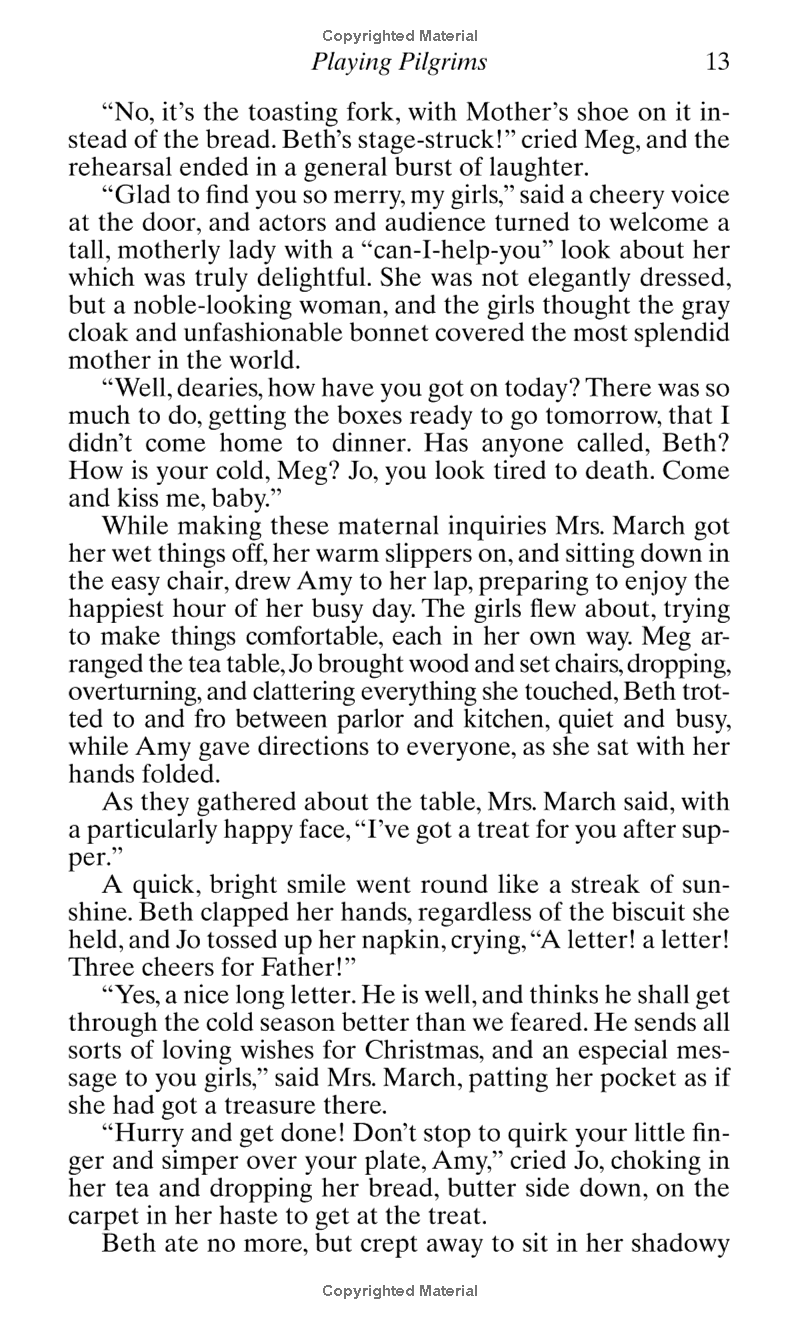 The four March sisters--Meg, Amy, Beth, and feisty Jo--share the joys and sorrows of growing up while their father is away at war. The family is poor in worldly goods, but rich in love and