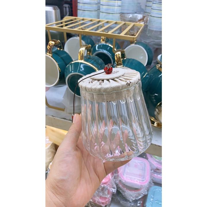 ✨Lọ đựng chè, thực phẩm khô bằng thủy tinh nắp vải vân kẻ sọc ( Giao nắp màu ngẫu nhiên )