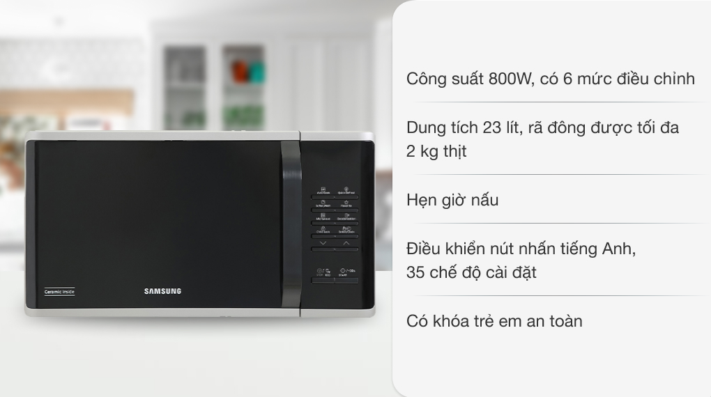 Lò vi sóng Samsung thiết kế hiện đại, màu sắc và kiểu dáng sang trọng, nổi bật trong không gian bếp sử dụng Lò vi sóng dung tích 23 lít phù hợp cho nhu cầu sử dụng nấu