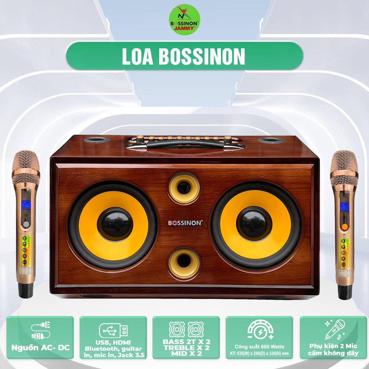Mua tại TiktokNguồn DC 12V bat in Bass 2T x 2, Treble x 2, mid x 2 _ Sử dụng bo CLASS D _Hỗ trợ USB, HDMI, Bluetooth, guitar in, mic in _Phụ kiện 2 mic cầm tay không dây, dây nguồn _Kích thước: 535 (W) x 290(D) x 330 (H)mm _Nặng 16kg _Công suất: 600Watts