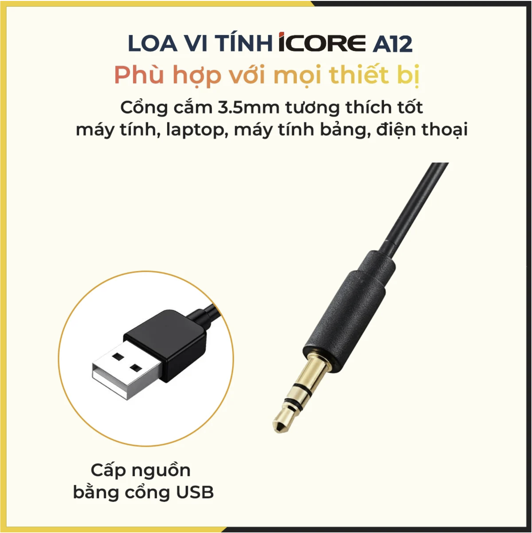 Loa Vi Tính iCore A12 sử dụng đầu cắm 3.5mm phổ biến có mặt hầu hết trên các thiết bị điện tử ngày nay. Kết nối có dây dài đến 1.2 m thuận tiện cho việc sắp đặt loa sao cho gọn gàng và trải nghiệm trọn vẹn nhất.