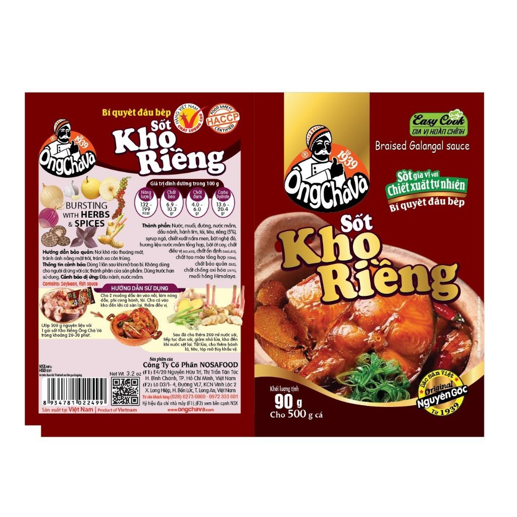 Sốt Kho riềng Ông Chà Và 90g là loại sốt sệt, sánh, đã chứa đủ gia vị, tiện lợi, chỉ cần bóc ra ướp với thịt và chế biến các món kho. Giữ trọn vị cay thơm, mang đến sự tiện lợi cho người đứng bếp cùng món thịt thơm ngon đặc trưng cho mỗi bữa cơm gia đình người Việt. 1. THÔNG TIN SẢN PHẨM - Thương hiệu: Ông Chà Và. - Trọng lượng: 90gr. - Số lượng: 15 Túi. - Thành phần: Nước mắm, đường, hành, tỏi,.. - HSD: 12 tháng kể từ ngày sản xuất. - Nhà sản xuất: Công ty cổ phần Nosafood. - Địa chỉ sản xuất: Lô D3/1-4 Đường VL7, KCN Vĩnh Lộc 2, xã Long Hiệp, huyện Bến Lức, tỉnh Long An. 2. MỘT SỐ MÓN ĂN GỢI Ý Dùng để ướp thịt và chế biến các món kho riềng. - Hướng dẫn sử dụng: + Bước 1: Ướp 1 gói Sốt Kho Riềng Ông Chà Và 90g với 500g thịt cá đã làm sạch trong 20 phút. + Bước 2: Cho 2 muỗng dầu ăn vào nồi, làm nóng dầu, phi cùng hành tỏi. Cho cá vào kho cho đến khi săn và thấm gia vị. + Bước 3: Cho 200ml nước sôi vào đun, giảm lửa nhỏ cho đến khi nước sệt lại. Tắt lửa cho thêm hành lá và tiêu. + Bước 4: Gắp ra đĩa và thưởng thức cùng cơm nóng. 3. HƯỚNG DẪN BẢO QUẢN - Để nơi thoáng mát, tránh tiếp xúc ánh nắng mặt trời. - Sau khi mở bao bì, gói kín, bảo quản trong ngăn mát tủ lạnh. 4. CAM KẾT TỪ SHOP - Sản phẩm đạt tiêu chuẩn ISO 22000, HACCP và đảm bảo An toàn vệ sinh thực phẩm. - Cam kết hàng rõ nguồn gốc, xuất xứ, đền tiền gấp đối nếu phát hiện hàng giả, hàng không đúng thương hiệu, quá hạn sử dụng khi khách hàng nhận đơn hàng. - Nếu giao sai/thiếu sản phẩm, Shop chịu trách nhiệm 100%. Trừ trường hợp sản phẩm bị móp méo về ngoại quan vì đây là do vấn đề khách quan từ nhiều yếu tố như vận chuyển, bảo quản hàng hóa từ kho. #ongchava #giavi #giavipho #giaviphobo #viengiavi #sotuopthitnuong #sate #satetom #satesodiep #satebaongu #botgiavi #suahat #suahathanquoc #tuongden #cariga #tuongot #botcari #nguvihuong