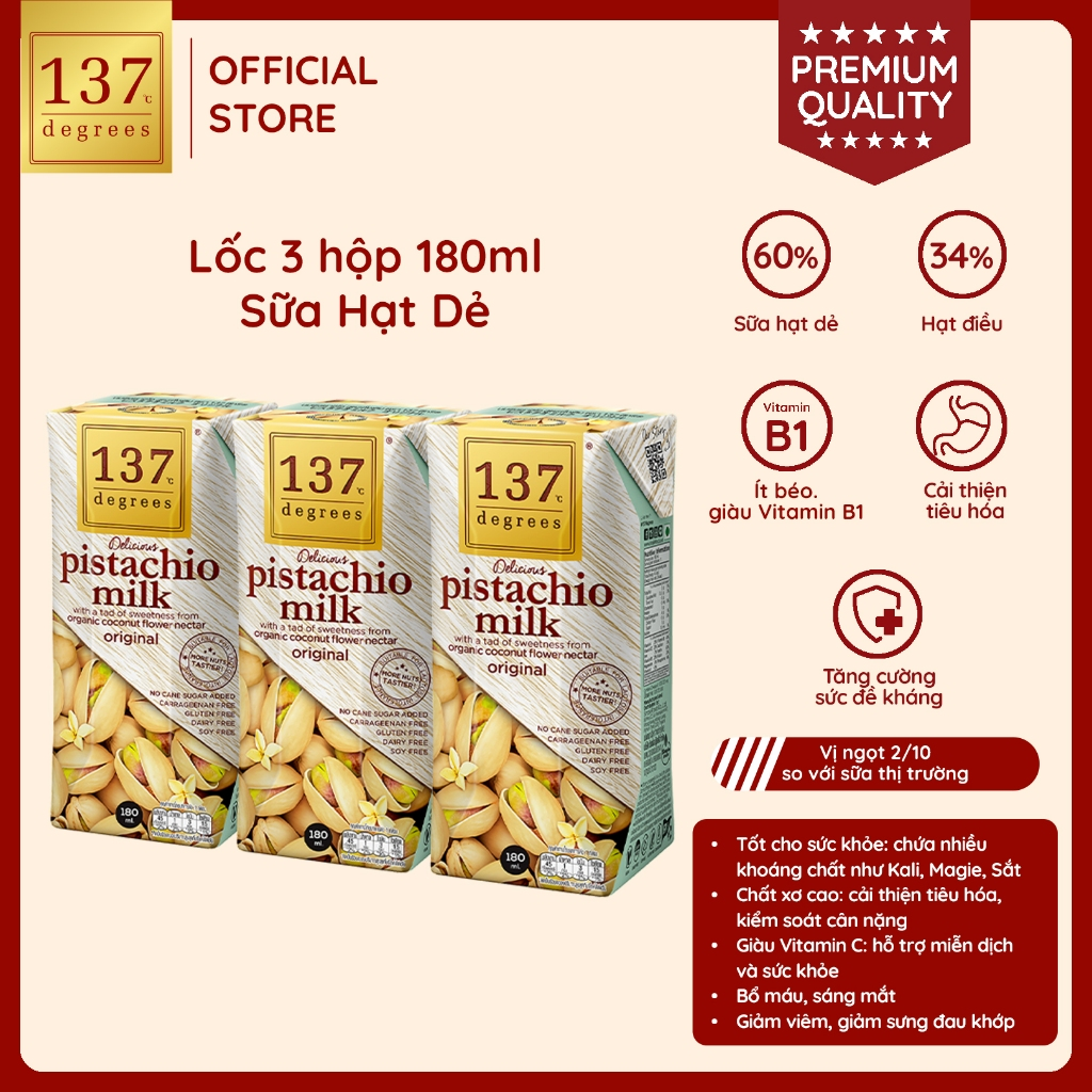Sữa hạt 137 Degrees là thương hiệu sữa hạt dinh dưỡng số 1 tại Thái Lan, với thành phần hạt tươi nguyên chất đến 99% KHÔNG ĐƯỜNG, KHÔNG CHẤT BẢO QUẢN, KHÔNG PHA TRỘN SỮA BÒ/ SỮA ĐẬU NÀNH, dùng mật hoa dừa hữu cơ tạo vị ngọt thanh nhẹ cho sữa, nguồn hạt hạnh nhân chất lượng từ California, Hoa Kỳ. Thành phần sữa hạt dẻ cười nguyên chất 137 degrees: 60% sữa hạt dẻ, 34% hạt điều, 5% hạt hướng dương, 1% mật hoa dừa hữu cơ. Sữa hạt hạnh nhân chứa nhiều Axit folic, Omega 3, Canxi, Magie, Vitamin B, E … mang lại nhiều công dụng: ✓ Hỗ trợ ngăn ngừa các bệnh về tim mạch, đột quỵ, giảm nguy cơ ung thư ✓ Tăng cường sức khỏe não bộ, giúp giảm chứng mất trí nhớ ✓ Hỗ trợ quá trình giảm cân tự nhiên ✓ Làm chậm quá trình oxy hóa, duy trì làn da tươi sáng ✓ Giúp giảm nguy cơ sinh non, ngừa tiểu đường thai kì ✓ Hỗ trợ dinh dưỡng cho người ăn chay, tiểu đường.   137 Degrees sử dụng công nghệ đóng hộp vô trùng Tetra Pak 7 lớp (Thuỵ Điển) có thể bảo quản sữa ở nhiệt độ thường trong thời gian dài (12 tháng) mà vẫn giữ nguyên hương vị tươi ngon và dưỡng chất của sữa.